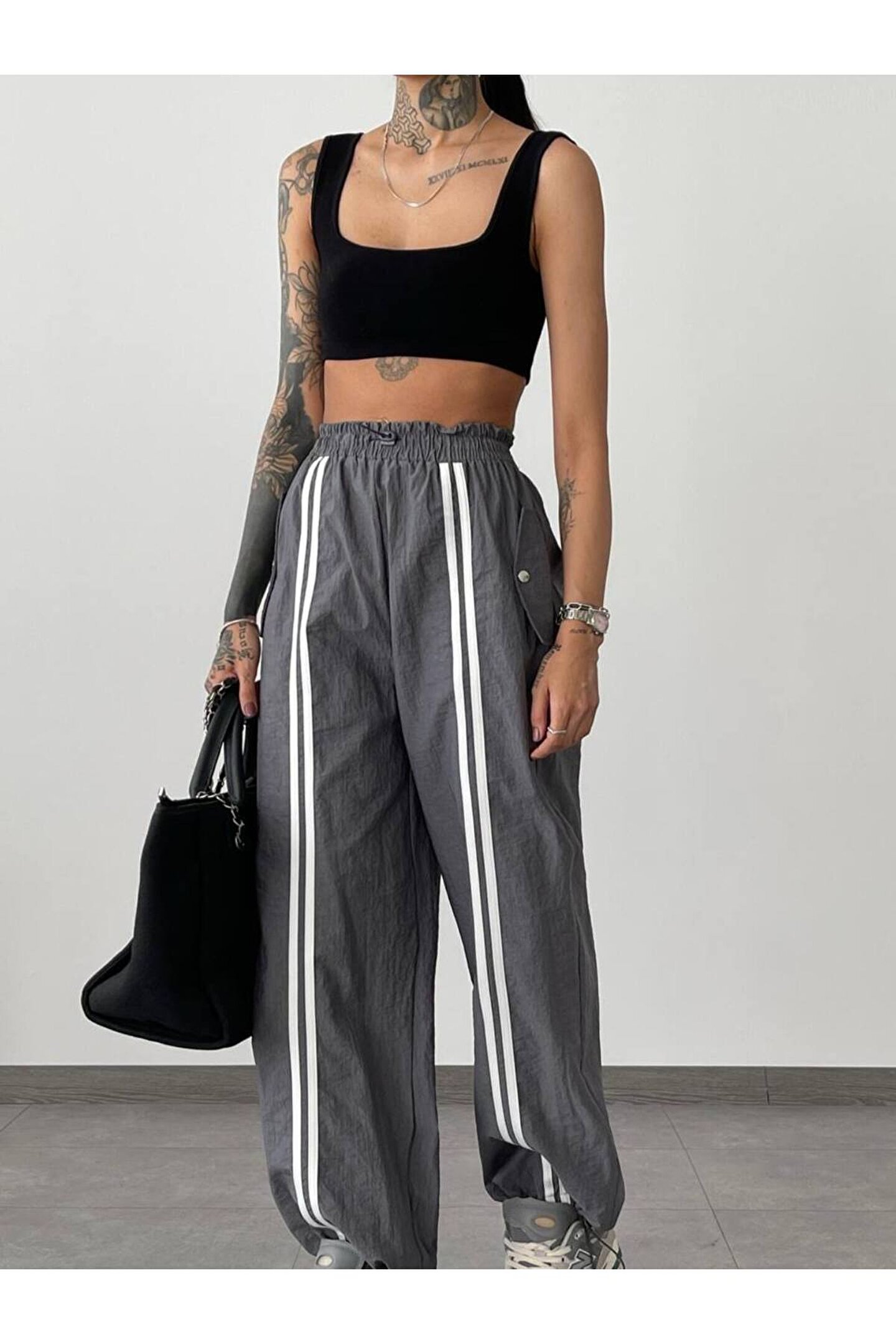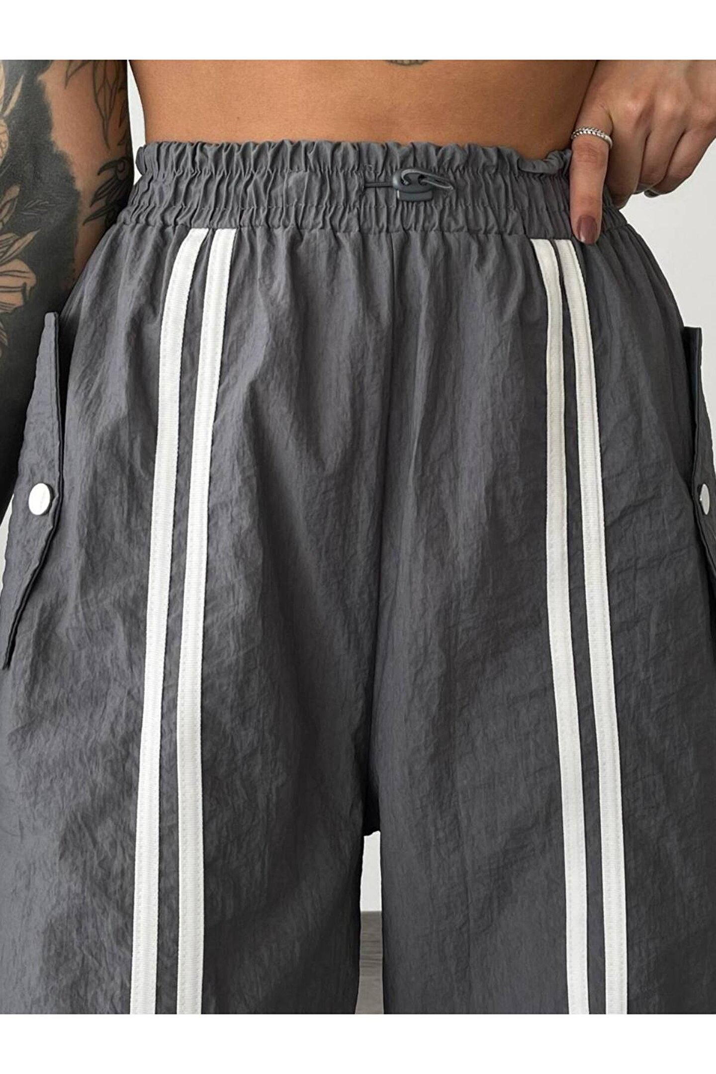 popibutik Cep Detaylı Lastikli Gri Paraşüt Pantolon