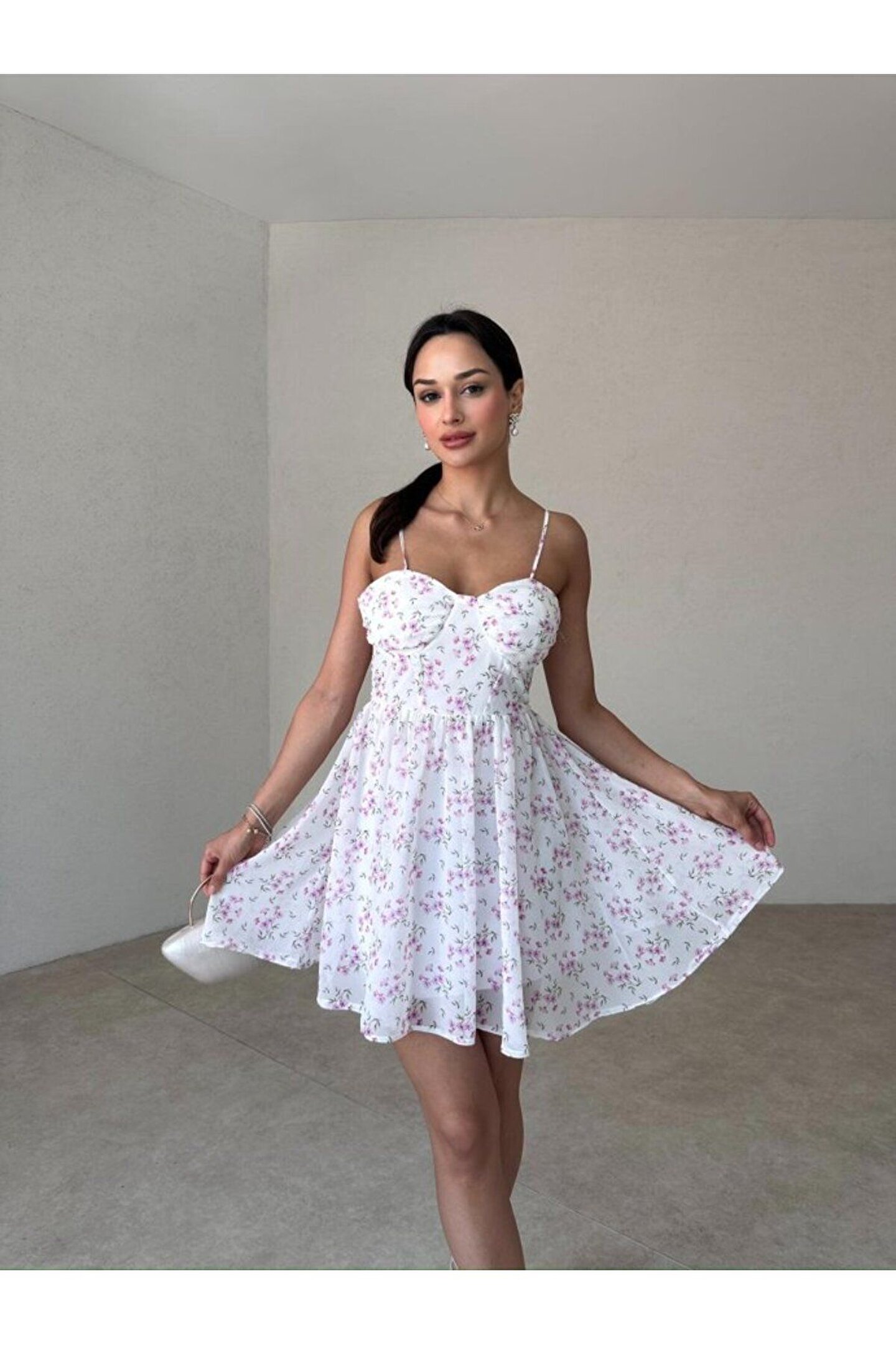 popibutik Çiçek Desenli Mini Beyaz Elbise