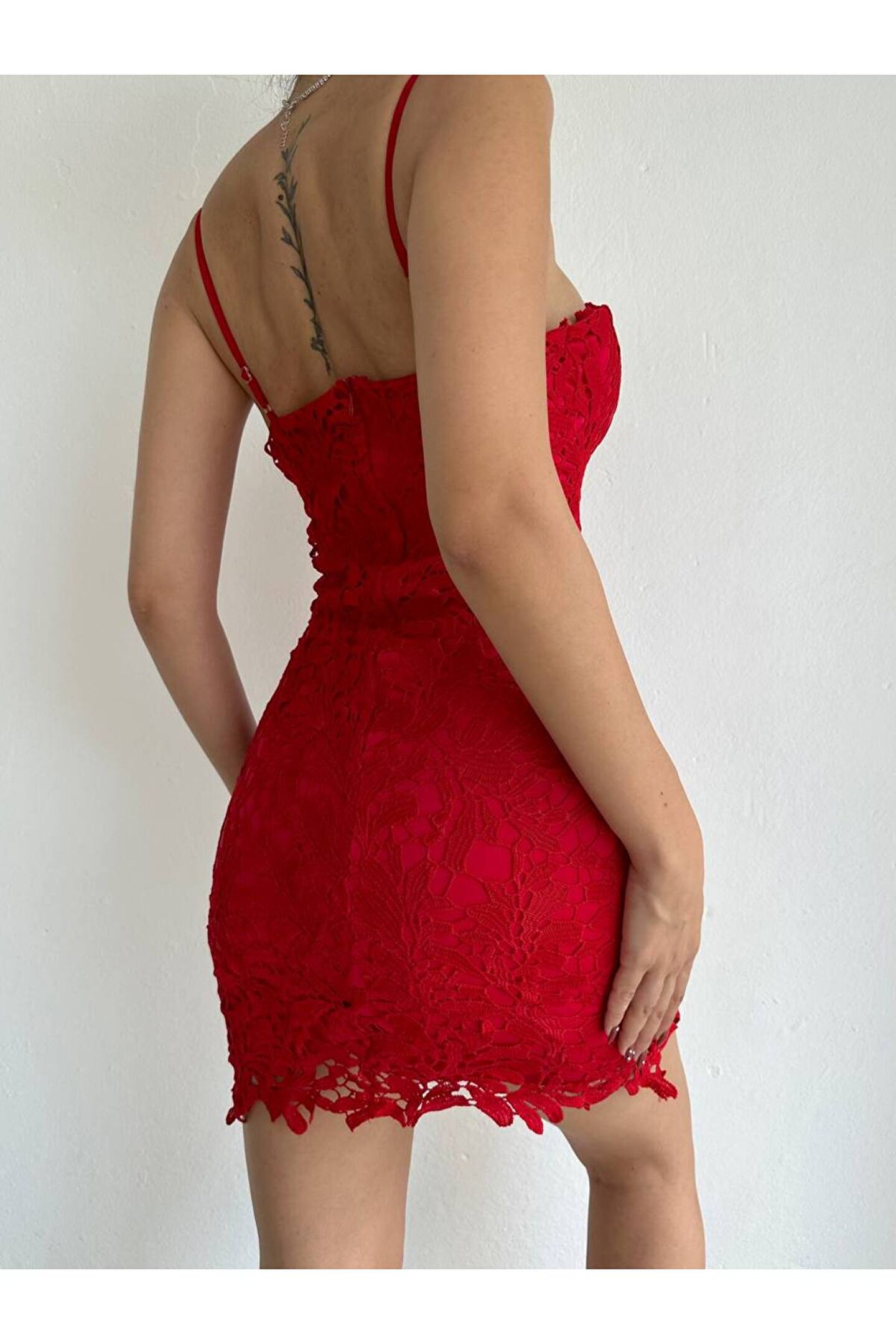 popibutik Dantel Detaylı Askılı Mini Kırmızı Elbise