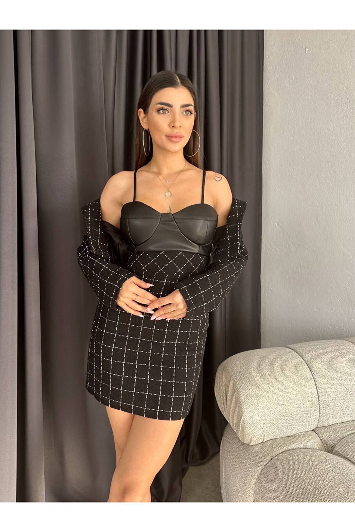 popibutik Deri Detaylı Tüvit Kumaş Elbise Ceket Takım