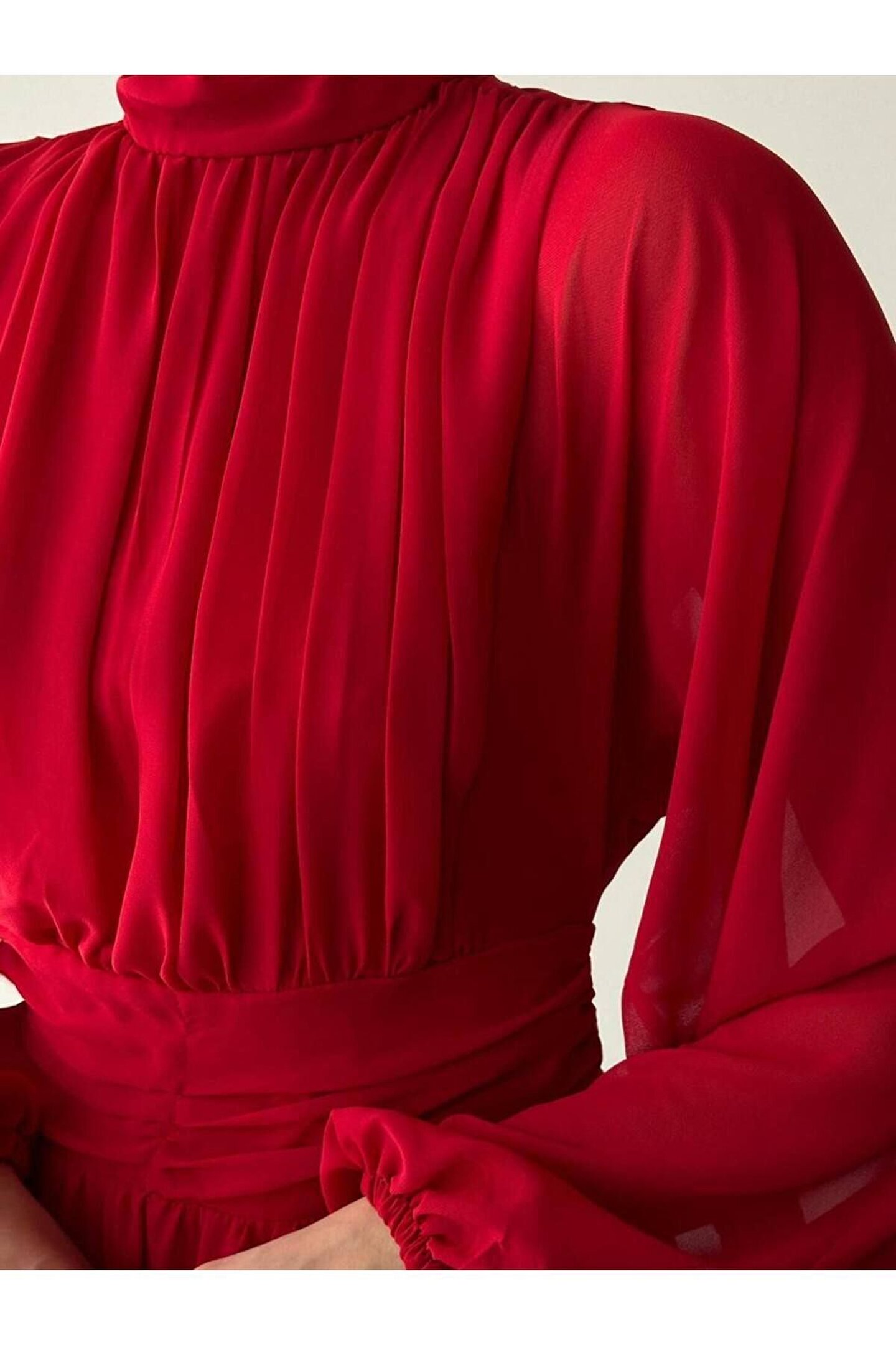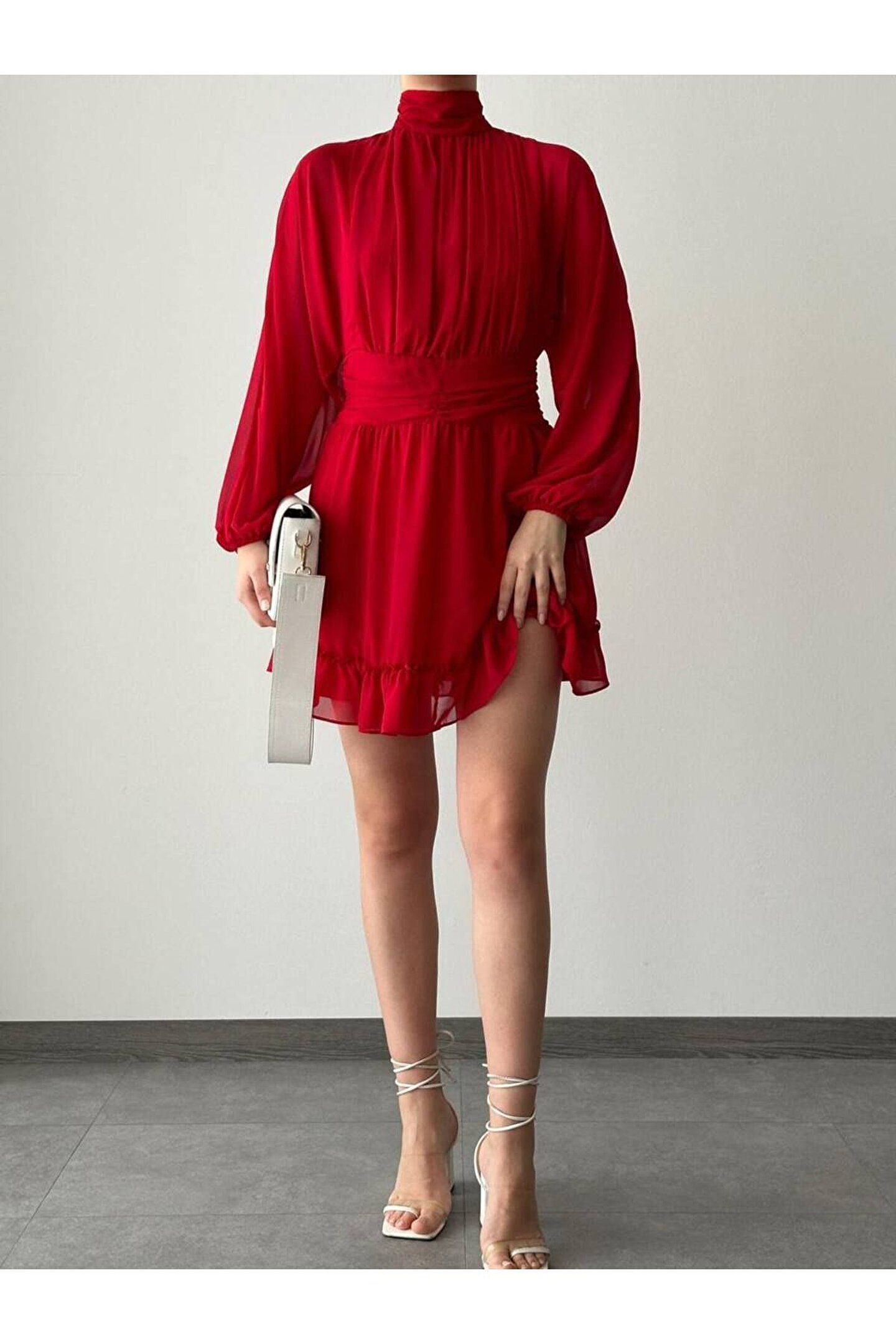 popibutik Dik Yakalı Drapeli Mini Kırmızı Şifon Elbise