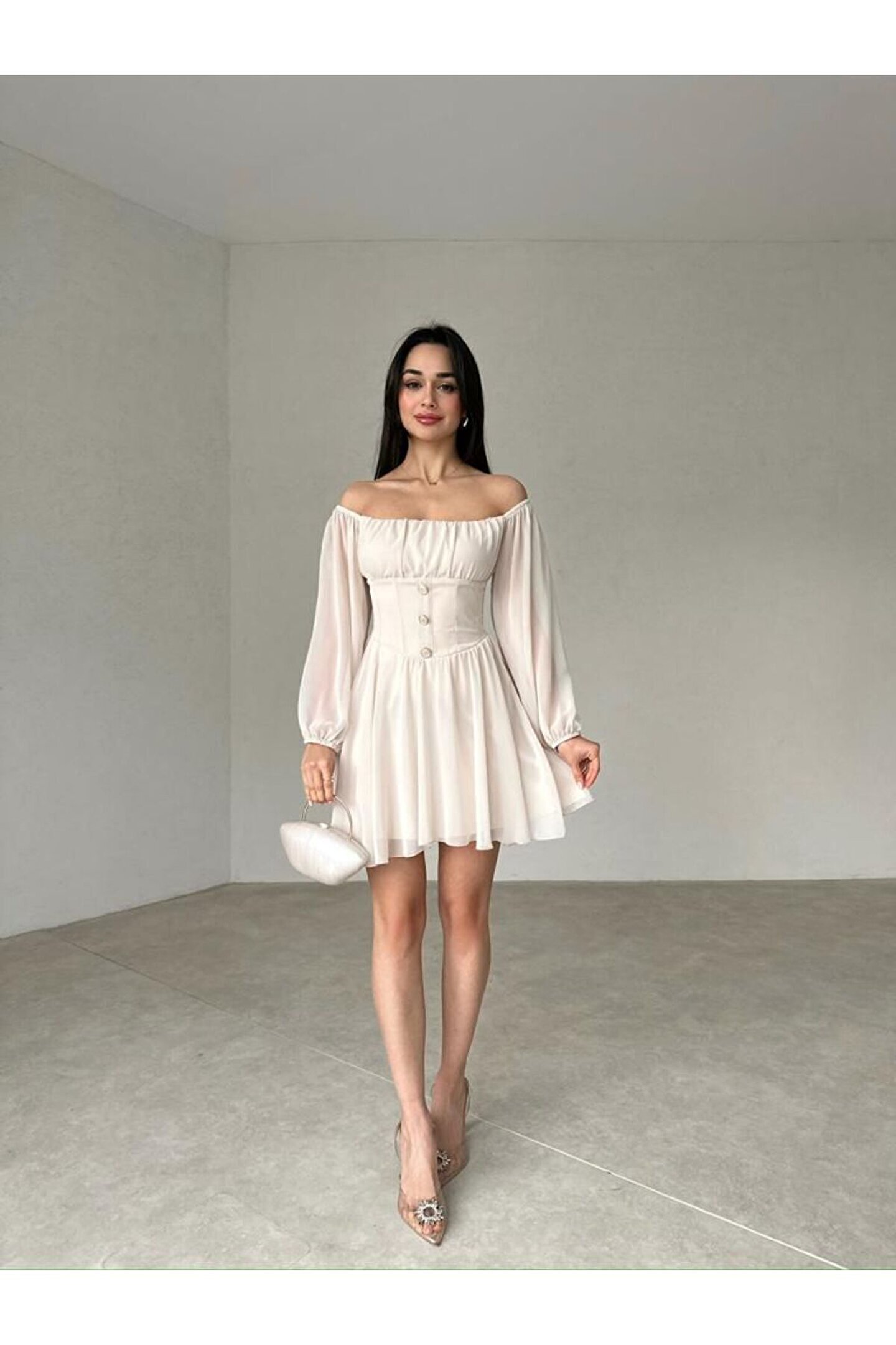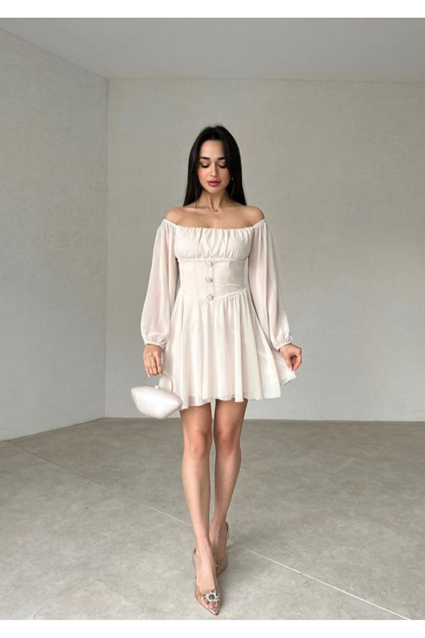 Zarif düğme detaylarıyla süslenmiş mini şifon elbise, günlük kullanımdan özel davetlere kadar her ortamda şıklığınızı konuşturmanızı sağlar.; Basic koleksiyonunun sadeliğiyle öne çıkan bu elbise, zamansız tasarımıyla tüm yaş gruplarına hitap eder.; Carmen yaka detayı ile feminen bir duruş sergileyen bu elbise, uzun kolları sayesinde mevsim geçişlerinde ideal bir tercih olabilir.; Şifon dokusuyla hafif ve nefes alabilen yapısı, gün boyu konforunuzdan ödün vermeden stilinizi korumanızı sağlar.; Astarlı yapısıyla rahatlık sunan bu elbisenin slim kalıbı, vücut hatlarınızı zarifçe sararak feminen siluetinizi ön plana çıkarır.; Dantel detaylarıyla zenginleştirilmiş düz tasarımı ile sade güzelliğin simgesi olan bu elbise, her tür aksesuarla kolayca kombinlenebilir.;