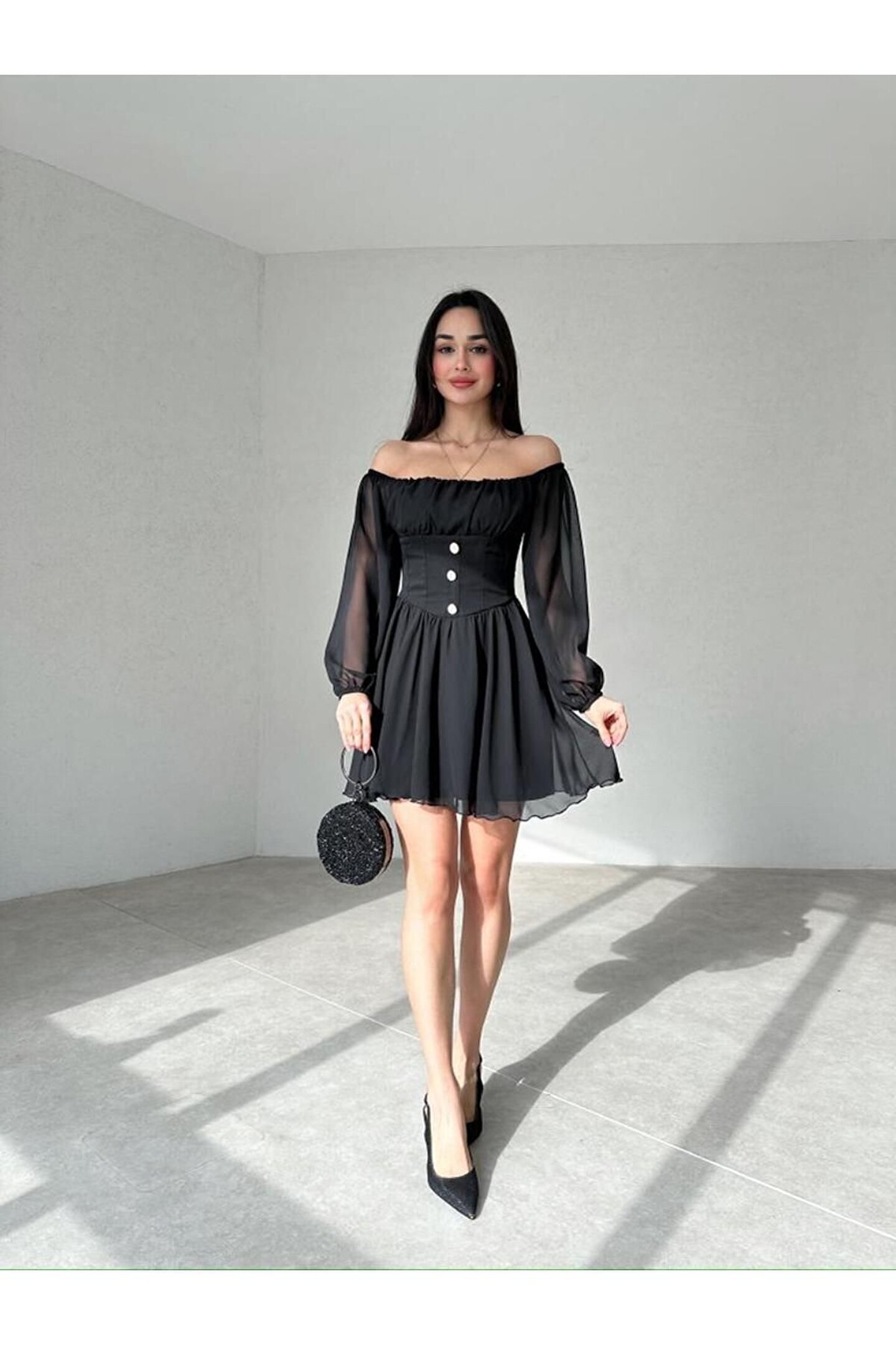 popibutik Düğme Detaylı Mini Şifon Elbise