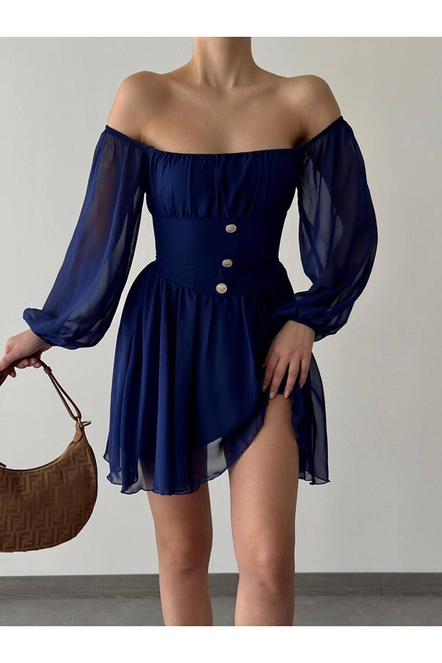 Bu şık mini şifon elbise, düğme detaylarıyla zarif bir görünüm sunar; Astarlı yapısı konforlu bir kullanım sağlar ve uzun kolları ile mevsim geçişlerine uyum sağlar; Slim kalıbı sayesinde vücut hatlarını nazikçe sararak feminen bir siluet oluşturur; Dantel detayları ile zenginleştirilmiş kumaşı, sofistike bir dokunuş katarken tüm yaş gruplarına hitap eden düz tasarımıyla her ortamda rahatlıkla tercih edilebilir; Basic koleksiyonunun parçası olan bu elbise, günlük kullanım için idealdir; Carmen yaka tasarımı ise boynunuzu zarifçe ortaya çıkarır ve düz deseniyle sade şıklığı ön plana çıkartır; ;;