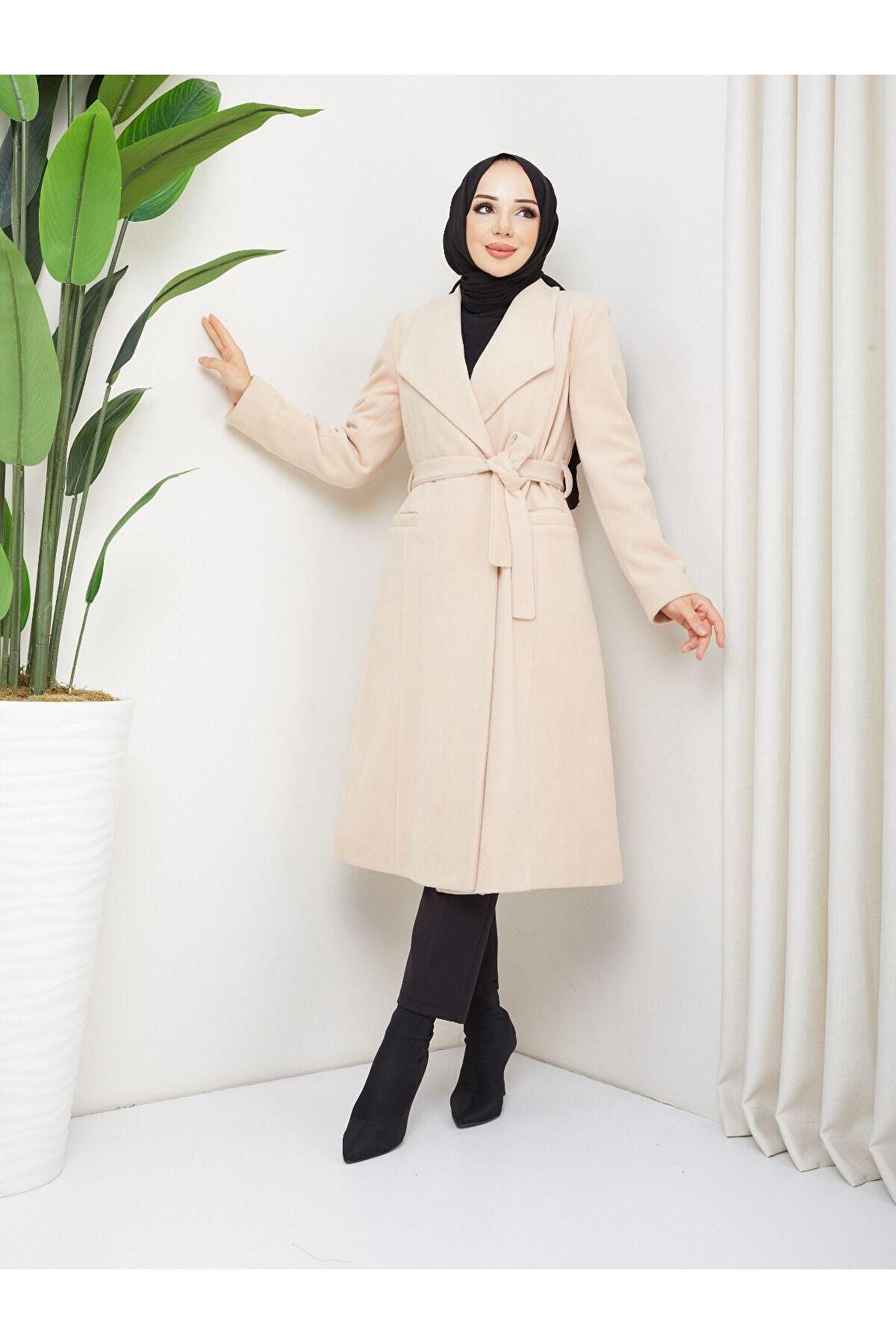 popibutik Gizli Düğmeli Yırtmaç Detaylı Cepli Kuşaklı Midi Boy Kaşe Kaban