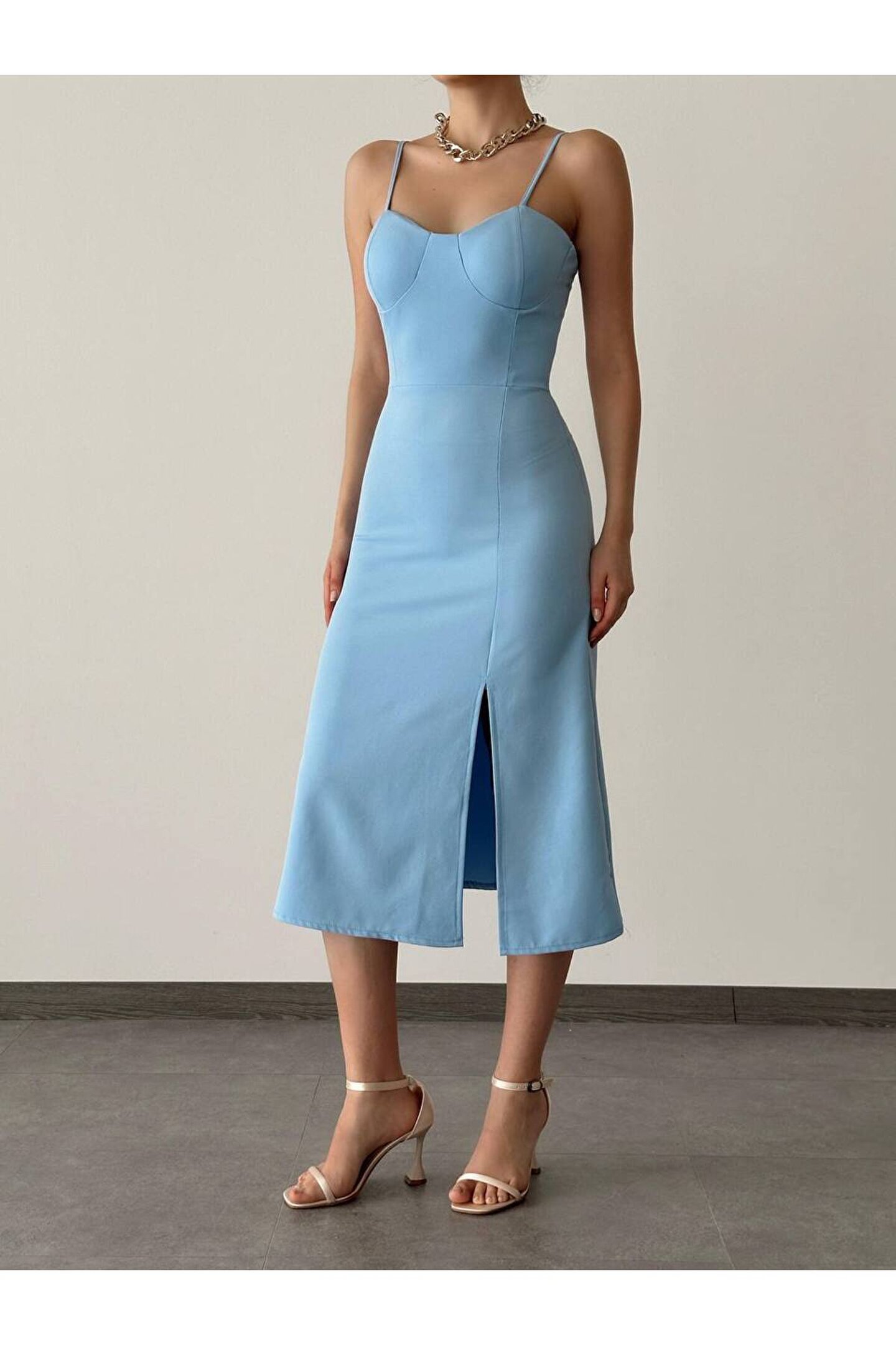 popibutik Gloplu Atlas Kumaş Yırtmaç Detaylı Midi Boy Mavi Elbise