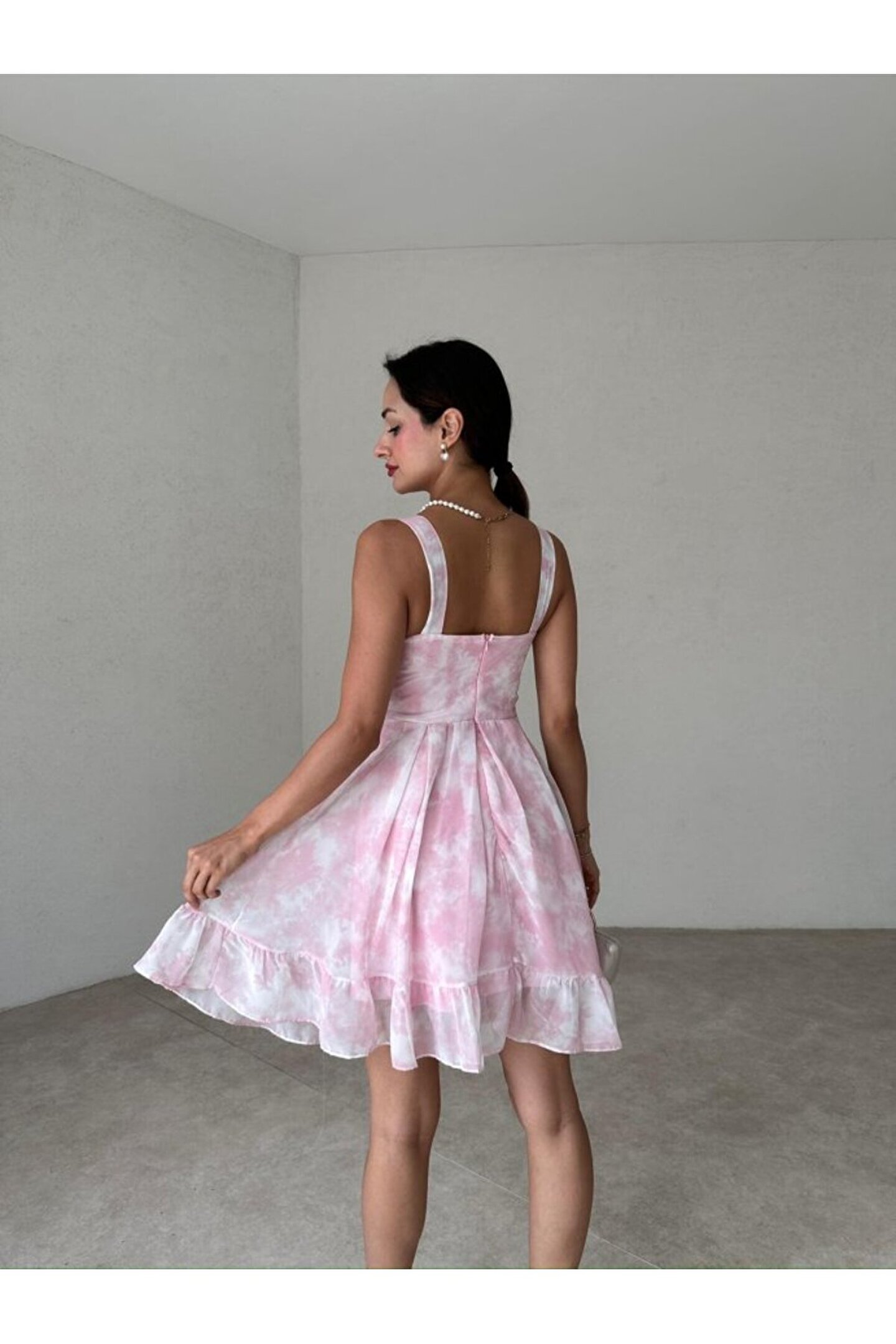 popibutik Gloplu Kalın Askılı Pile Etek Mini Şifon Pembe Elbise