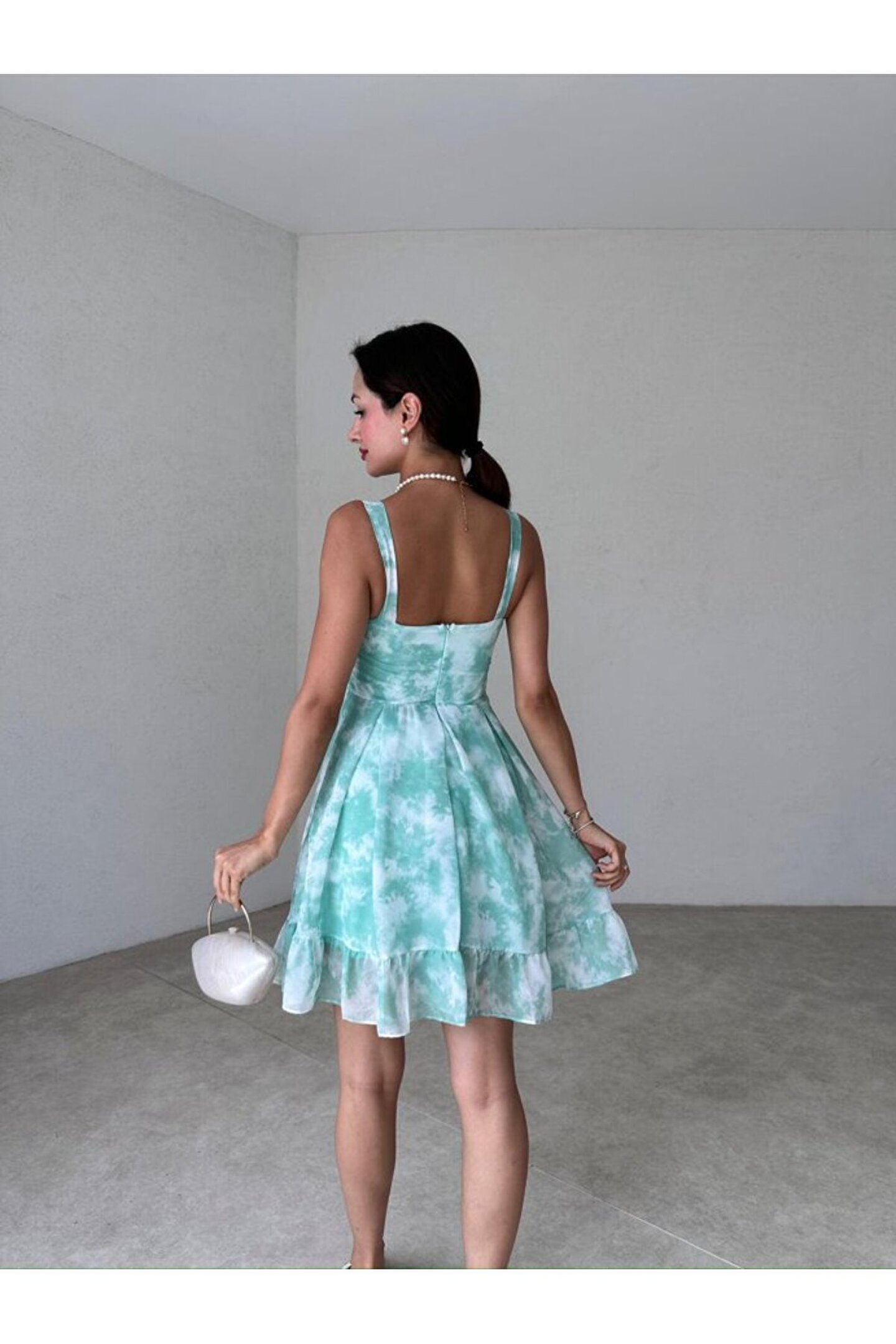 popibutik Gloplu Kalın Askılı Pile Etek Mini Şifon Yeşil Elbise