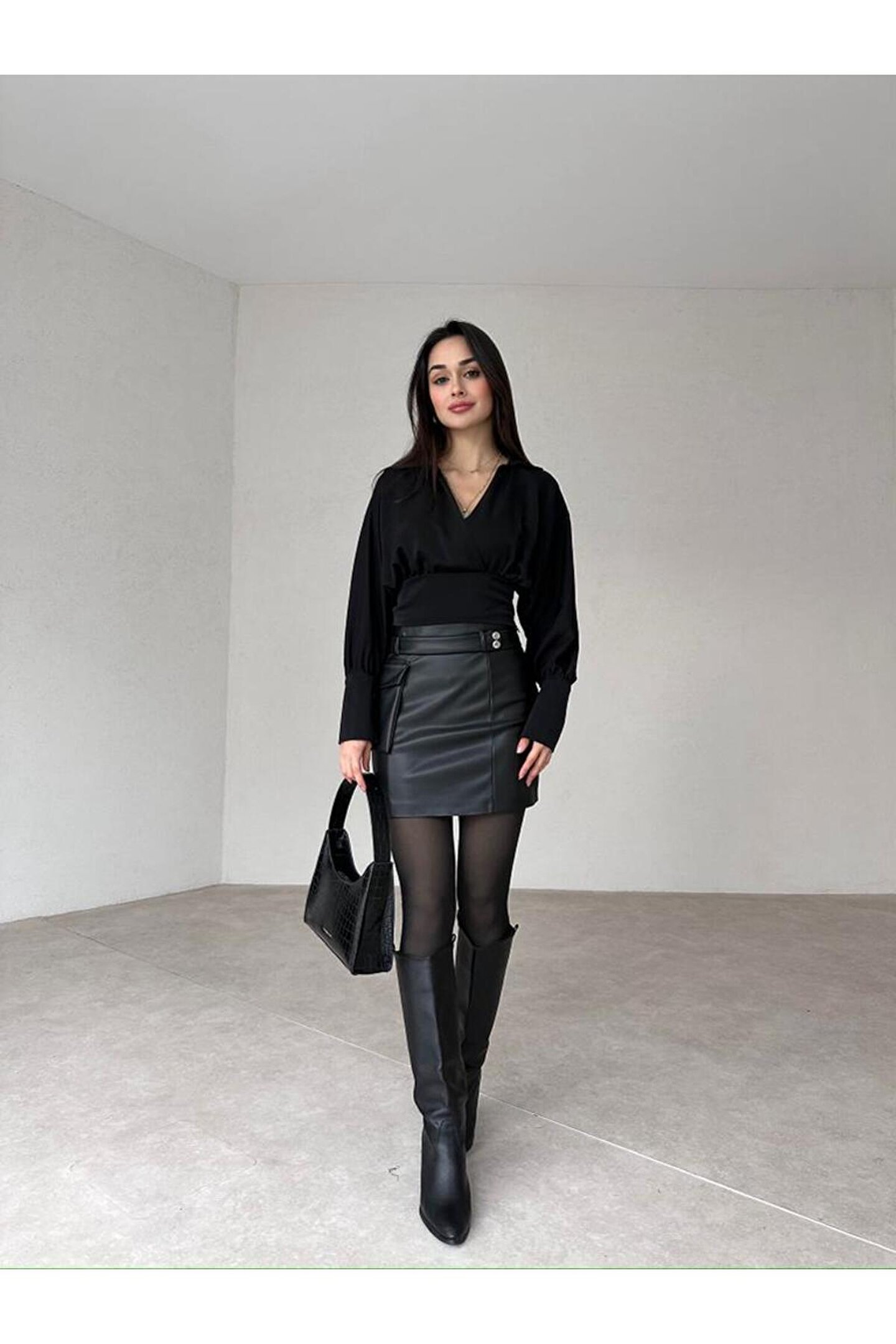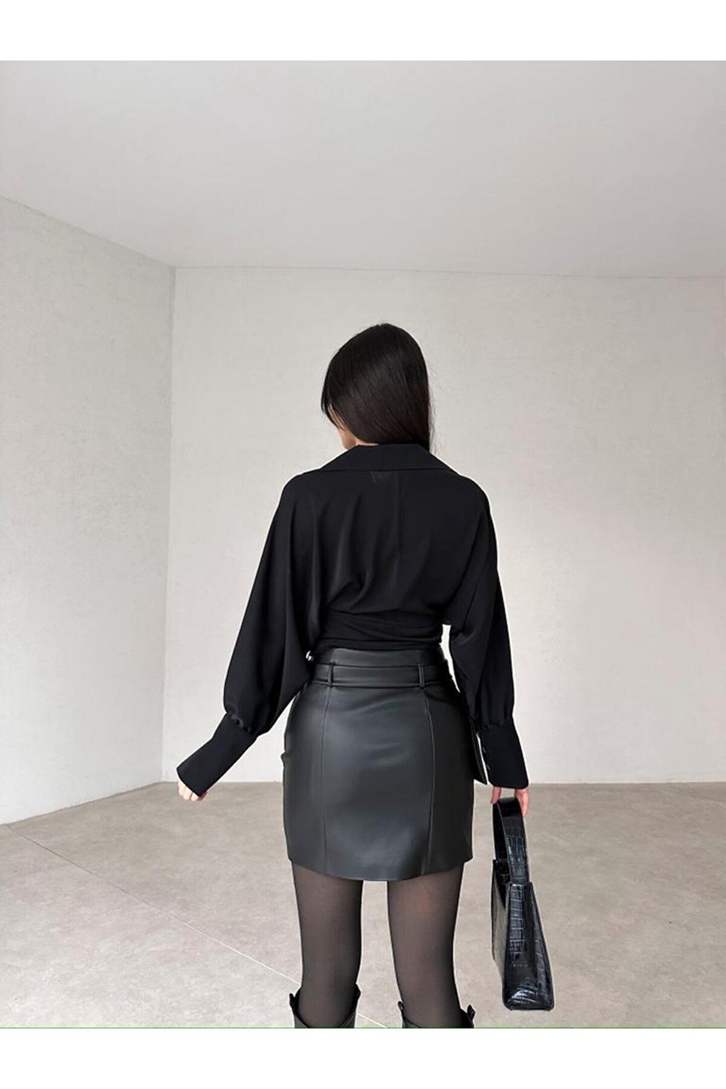 Gömlek-Etek Takım tam kalıplıdır. ; Gömlek omuzdan aşağı 43 cm uzunluğundadır. ; Gömlek yandan fermuarlıdır. ; Etek yüksek beldir. ; Takım altı belden aşağı 41 cm'dir. ; Etek deri kumaştır. ; Etek iç göstermemektedir. ; Takım esnek değildir. ; Sıklıkla kullandığınız bedeni tercih edebilirsiniz. ; Görseldeki model 170 cm, 55 kg'dır. ; Model üzerindeki takım S bedendir. ; Modelin kendi bedenide S bedendir. ; ( Takım halinde satıştadır ) ;