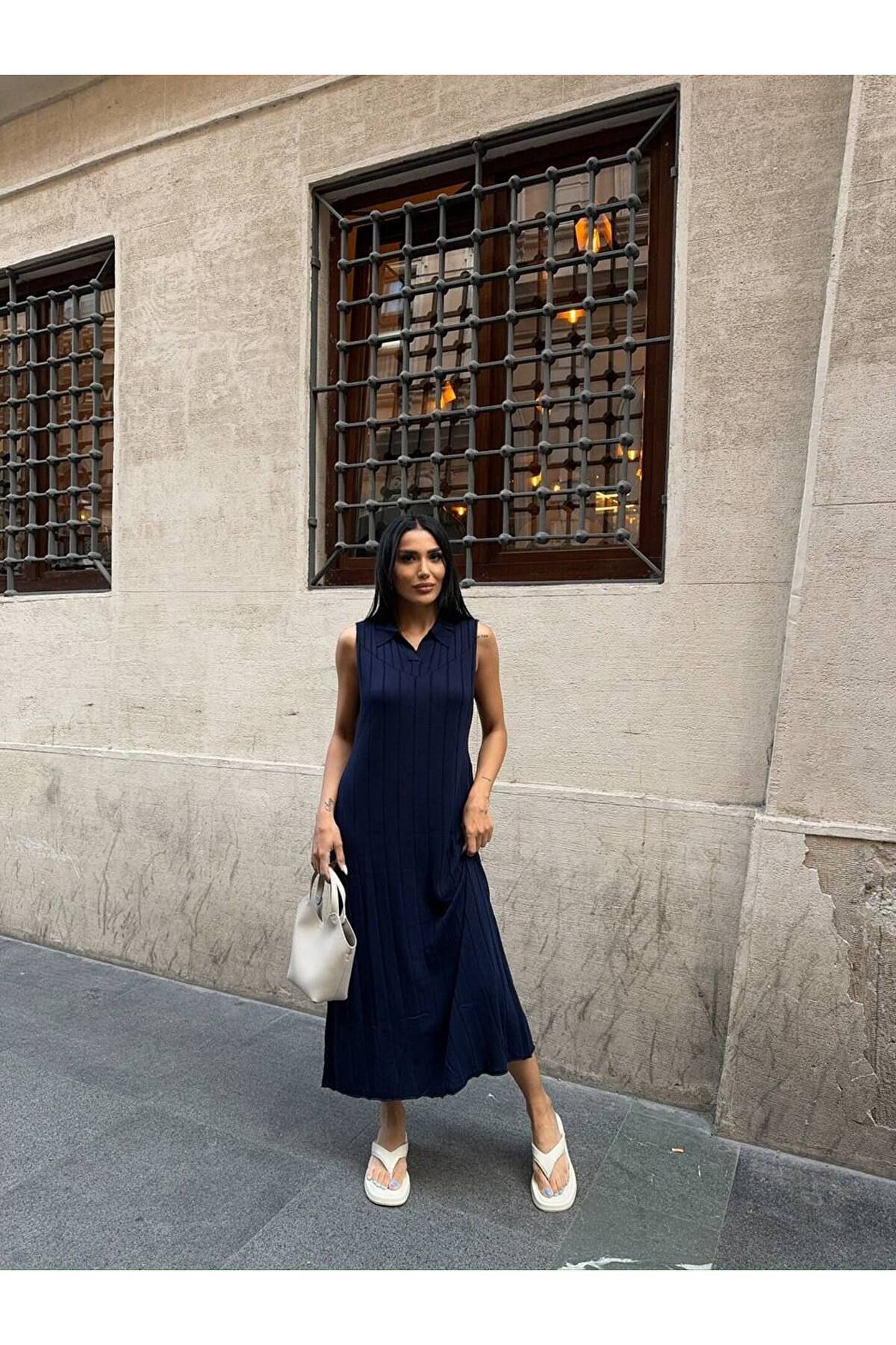 popibutik Gömlek Yaka Sıfır Kol Çizgi Desen Uzun Siyah Triko Elbise