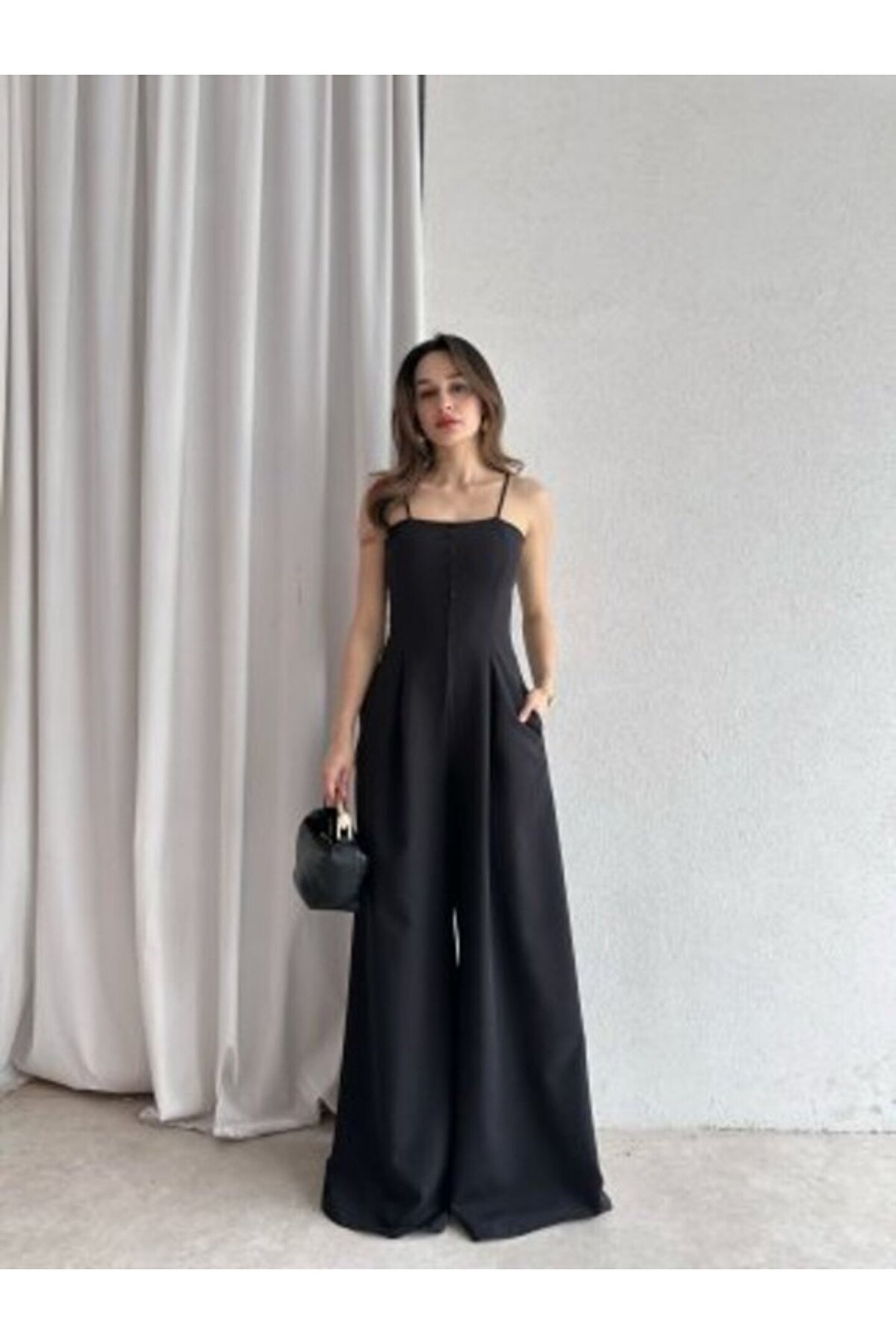 popibutik Kadın Askılı Kare Yaka Düğme Detaylı Tulum