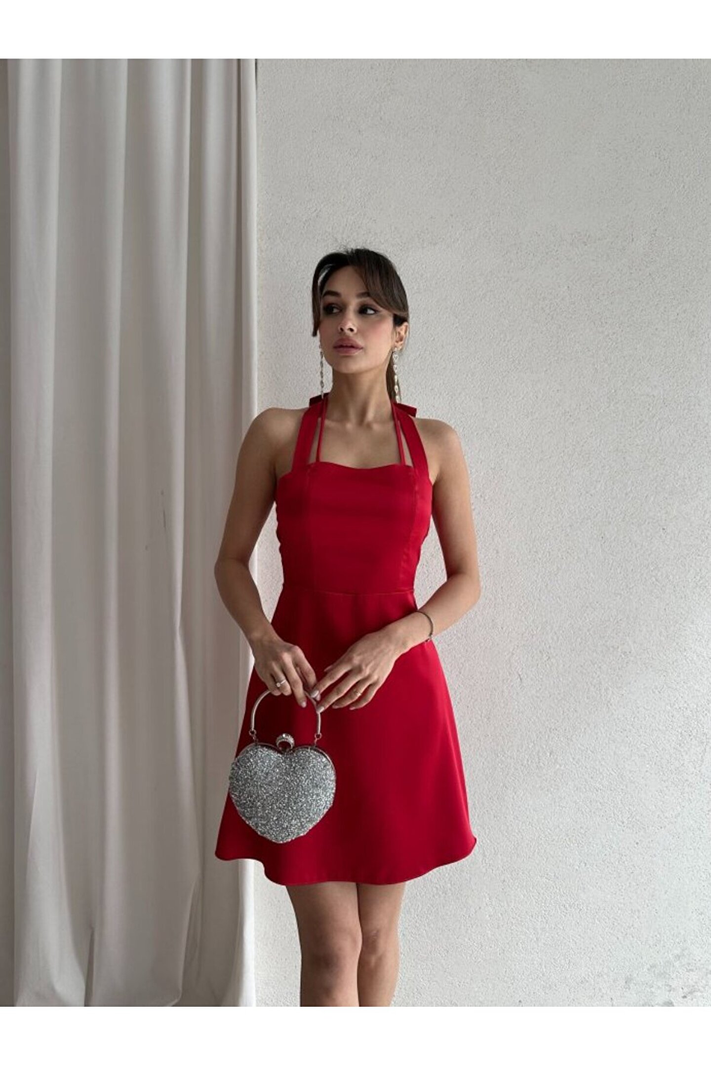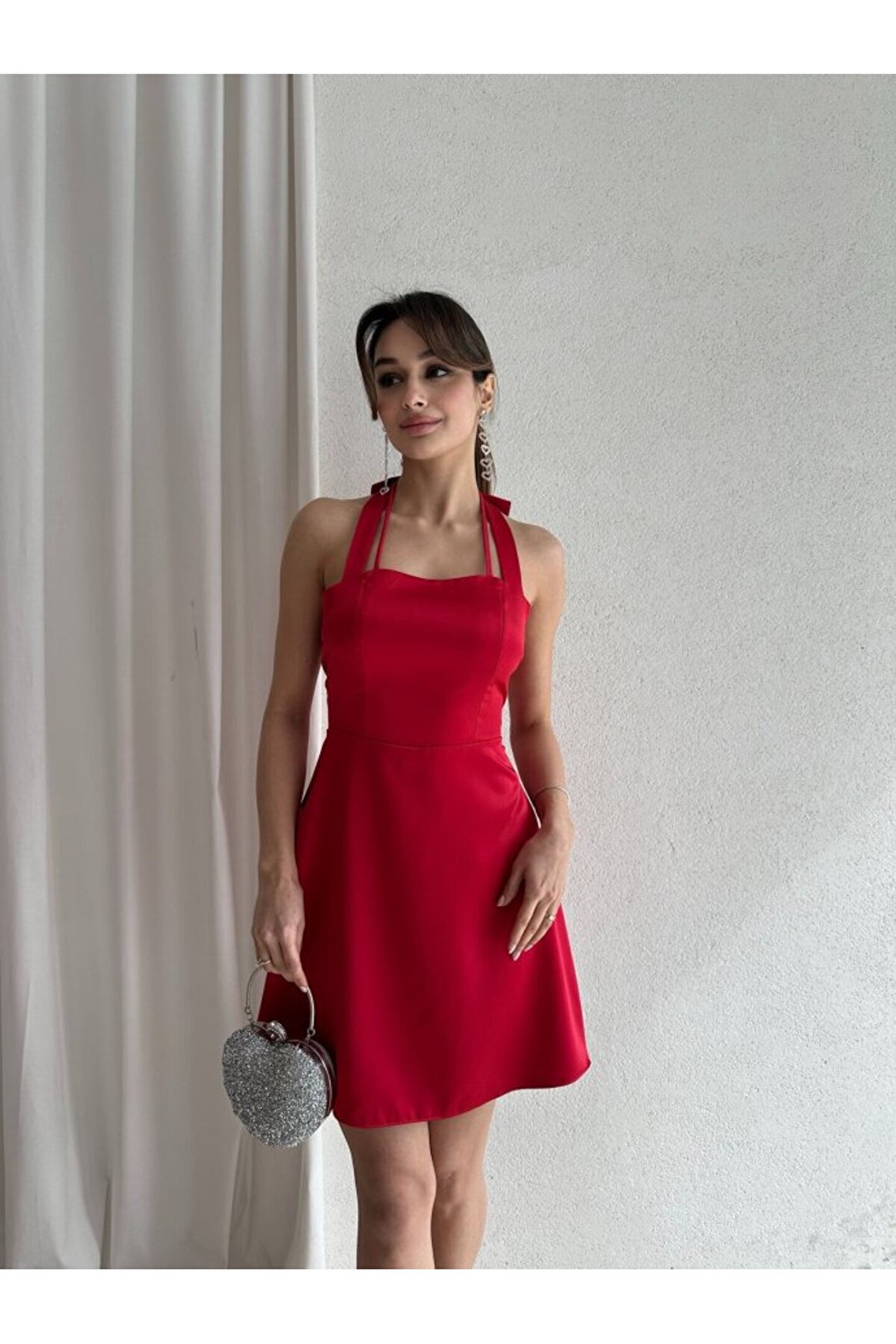popibutik Kadın Boyundan Bağlamalı Kurdela Detaylı Mini Saten Elbise