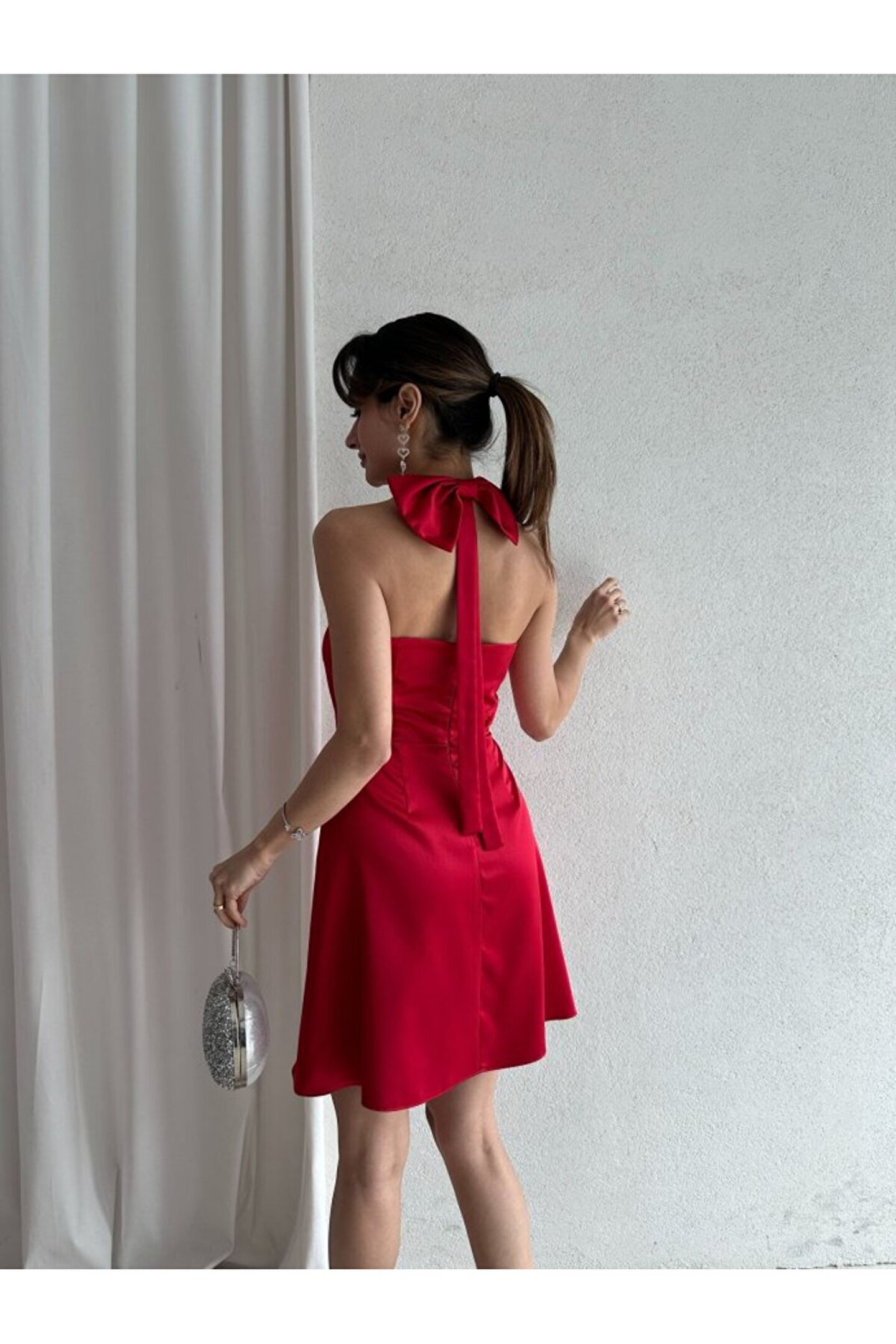 popibutik Kadın Boyundan Bağlamalı Kurdela Detaylı Mini Saten Elbise