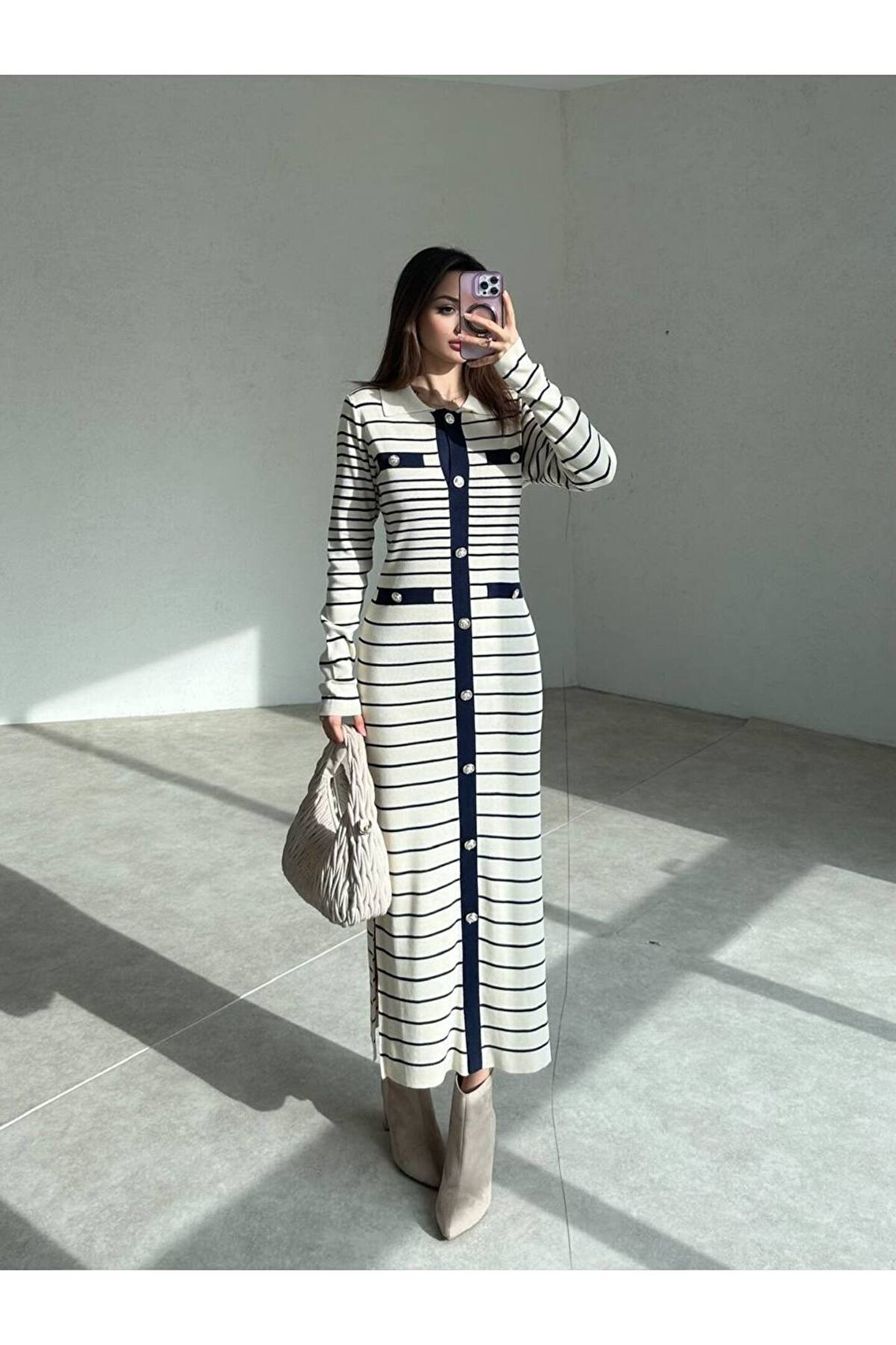 popibutik Kadın Çizgi Desen Maxi Triko Elbise