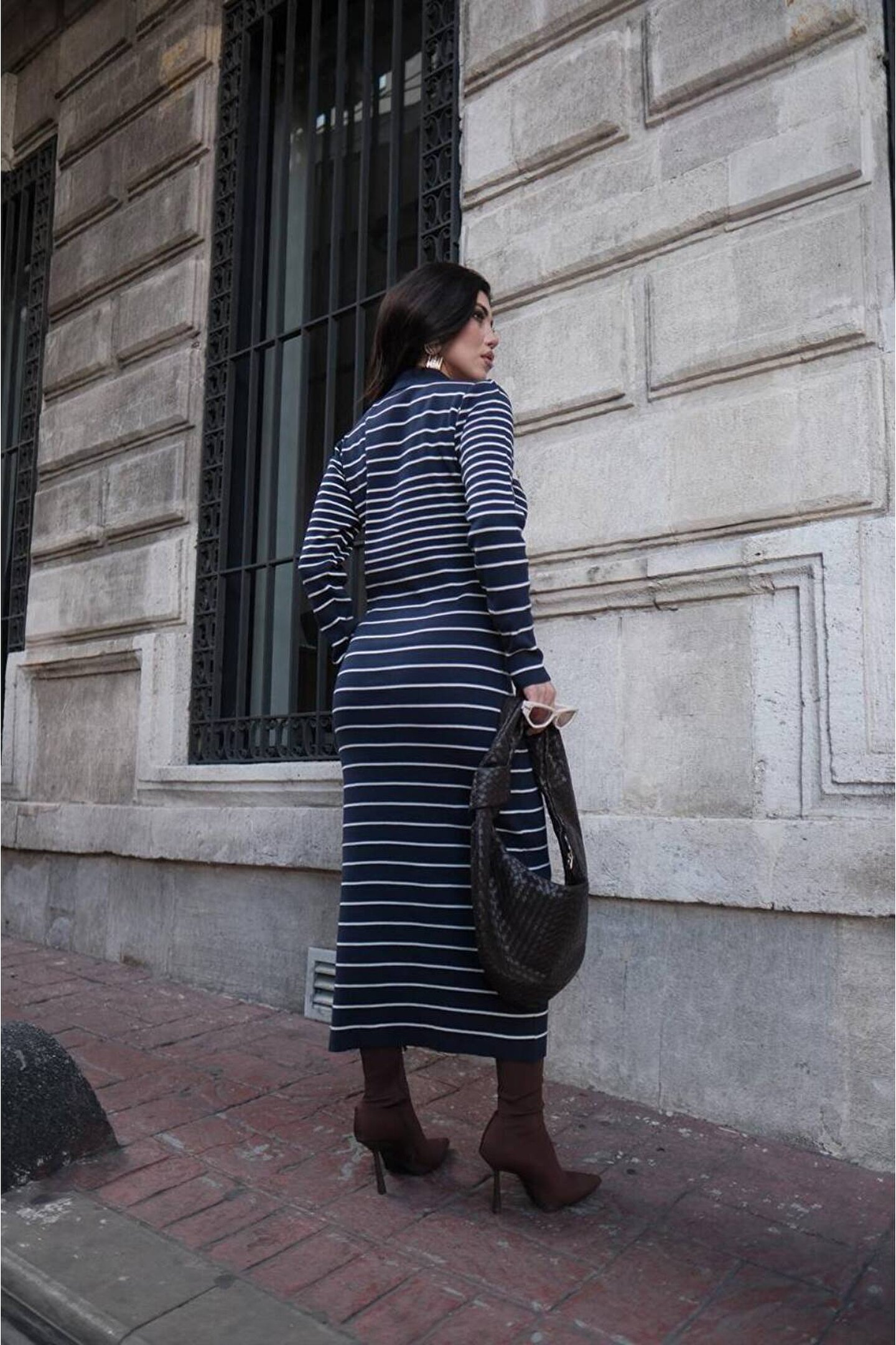 popibutik Kadın Çizgi Desen Maxi Triko Elbise
