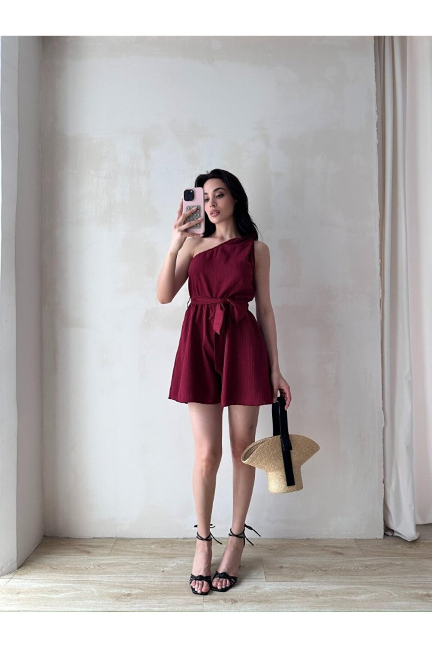 popibutik Kadın Tek Omuz Kuşaklı Mini Tulum