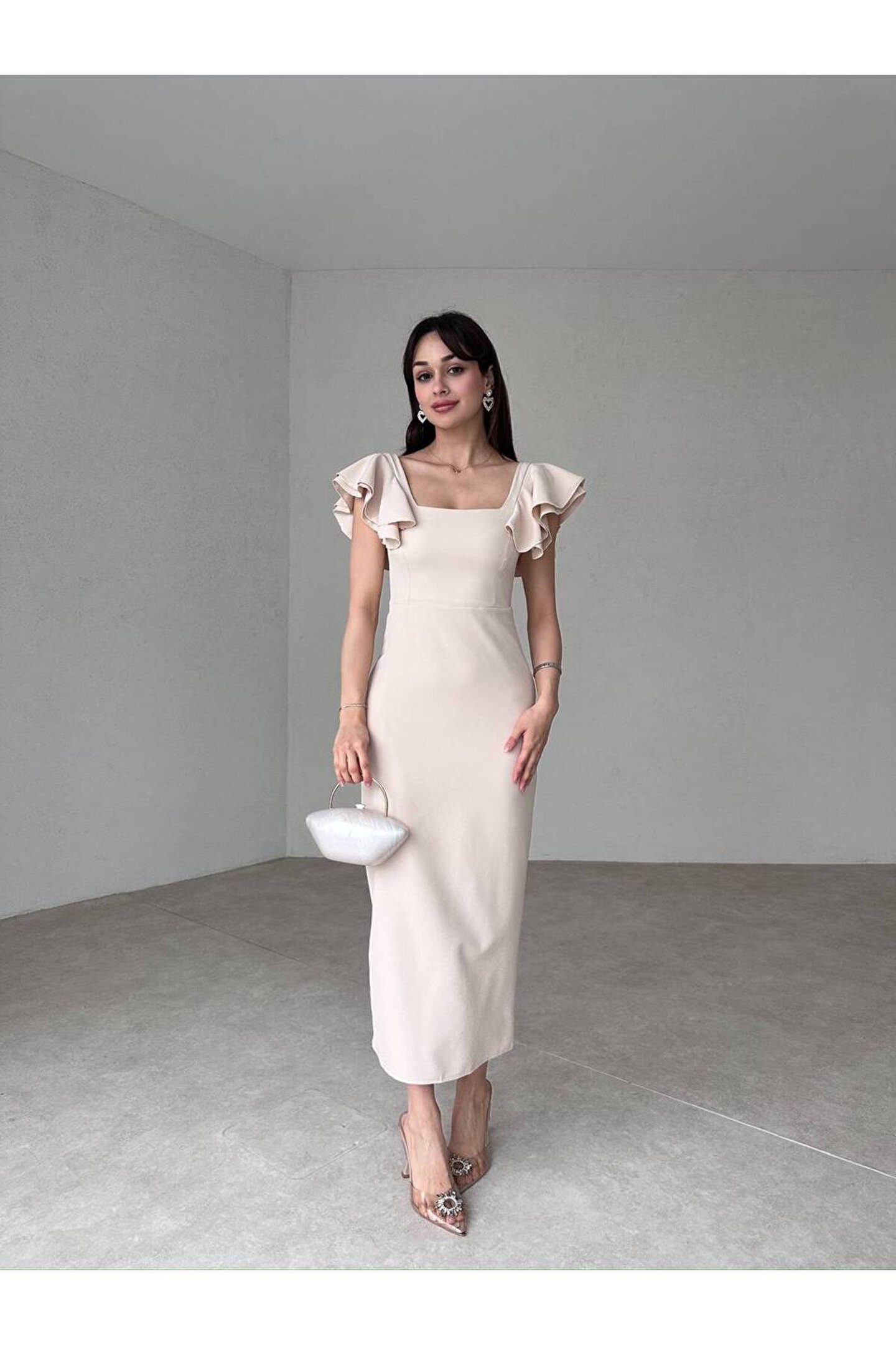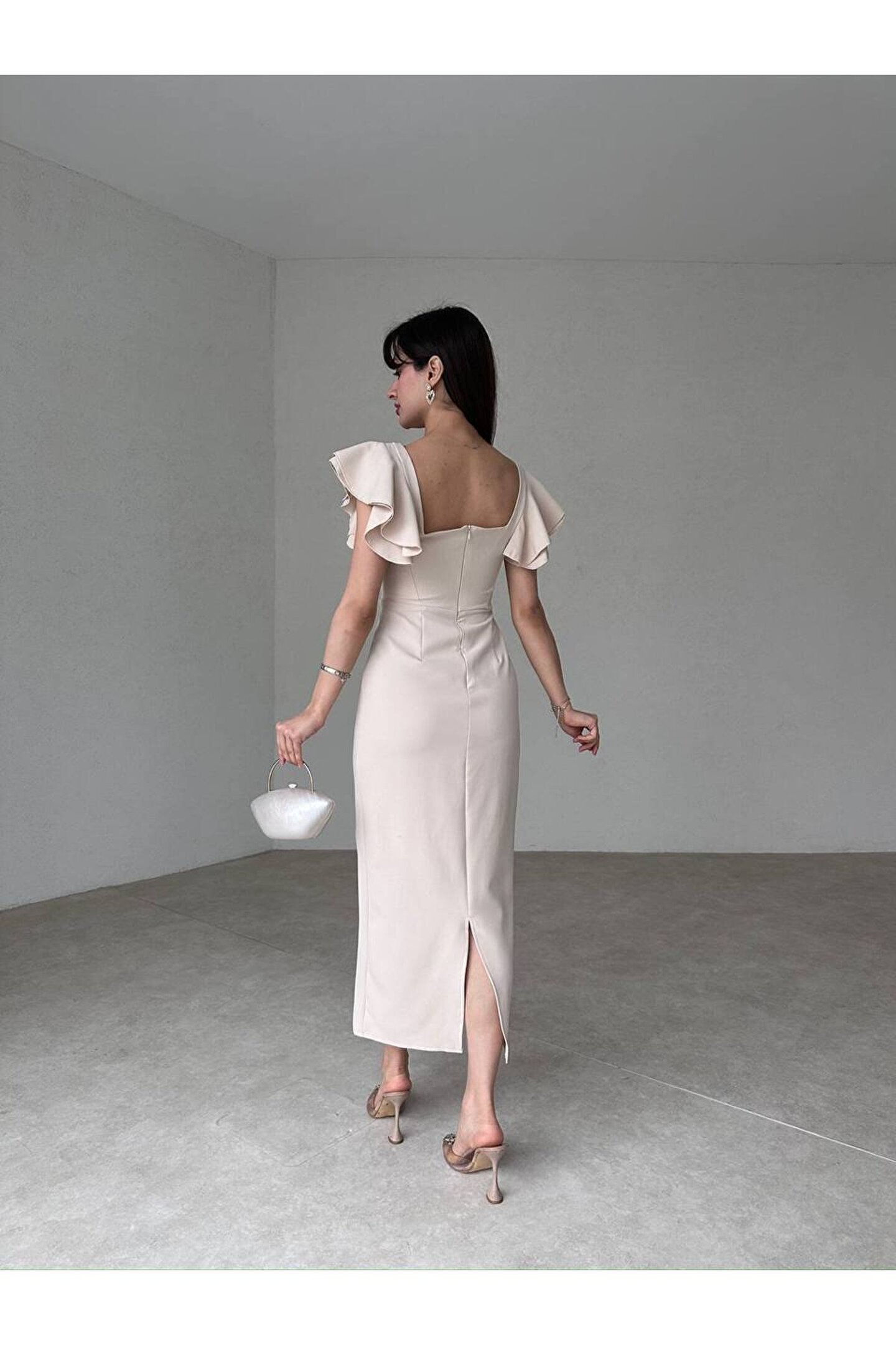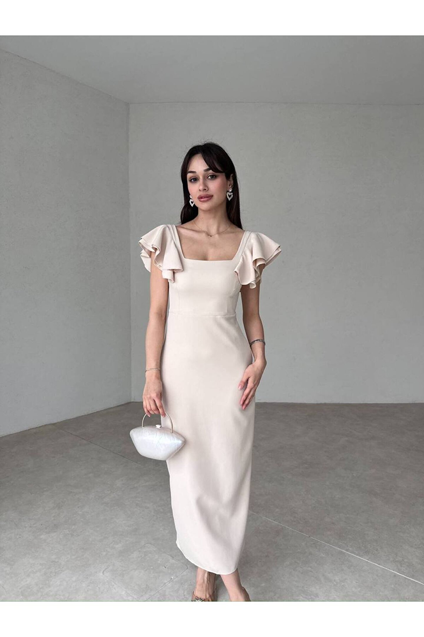 popibutik Kare Yaka Kol Detaylı Yırtmaçlı Atlas Kumaş Midi boy Vizon Elbise
