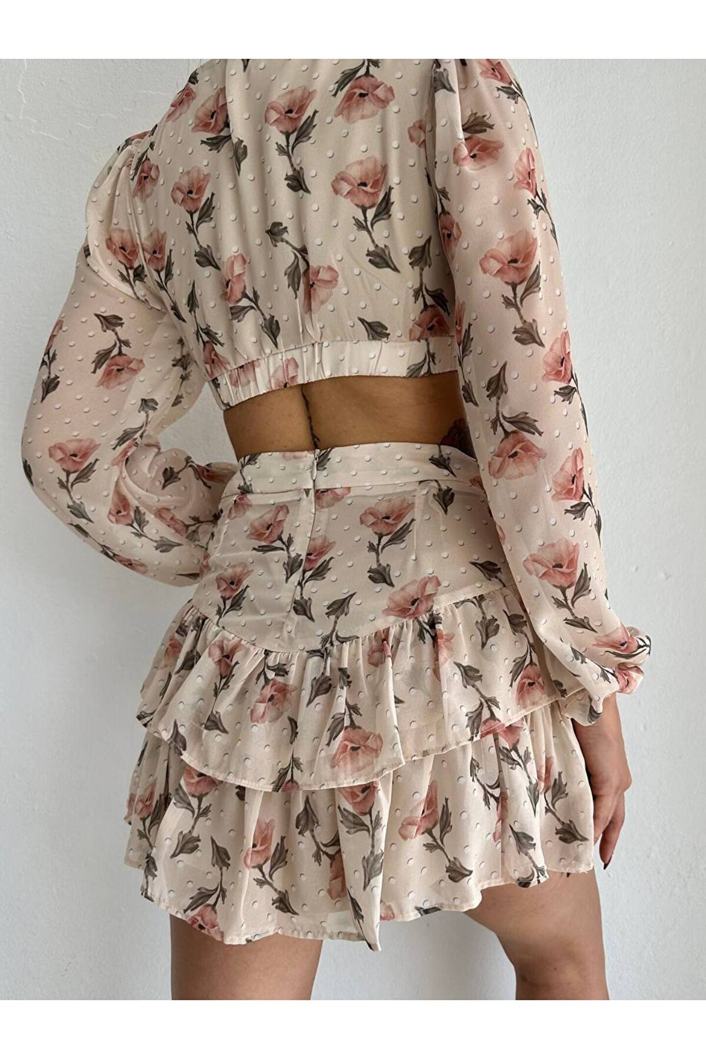 popibutik Kat Etek Gögüs Dekolteli Crop Şifon Kumaş Krem Takım