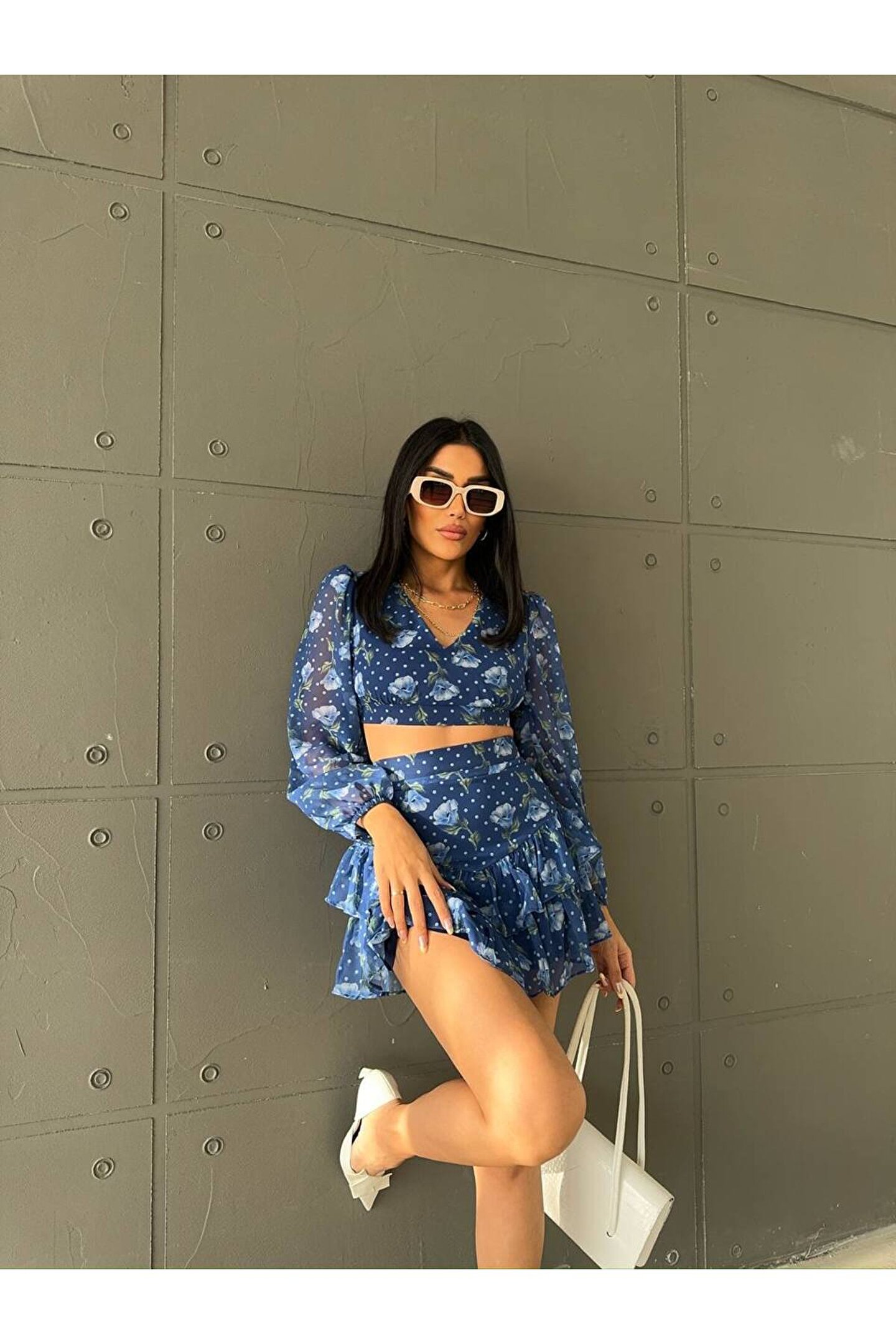 Gençlerin enerjisini yansıtan, slim kesim tasarımıyla modern ve şık bir görünüm sunar.; Çiçekli deseniyle feminen dokunuşları ön plana çıkaran bu takım, göz alıcı detaylarıyla dikkat çeker.; Örme şifon kumaşı sayesinde hafif ve nefes alabilen yapısıyla yaz ayları için idealdir.; Crop üstü ile trendleri takip eden gençler için mükemmel bir seçimdir; hem rahat hem de stil sahibi olmanızı sağlar.; Tüm yaş gruplarına hitap eden geniş beden skalasıyla herkes için uygunluk sunar.; Mavi rengiyle kolayca kombinlenebilir ve farklı aksesuarlarla zenginleştirilebilir.;
