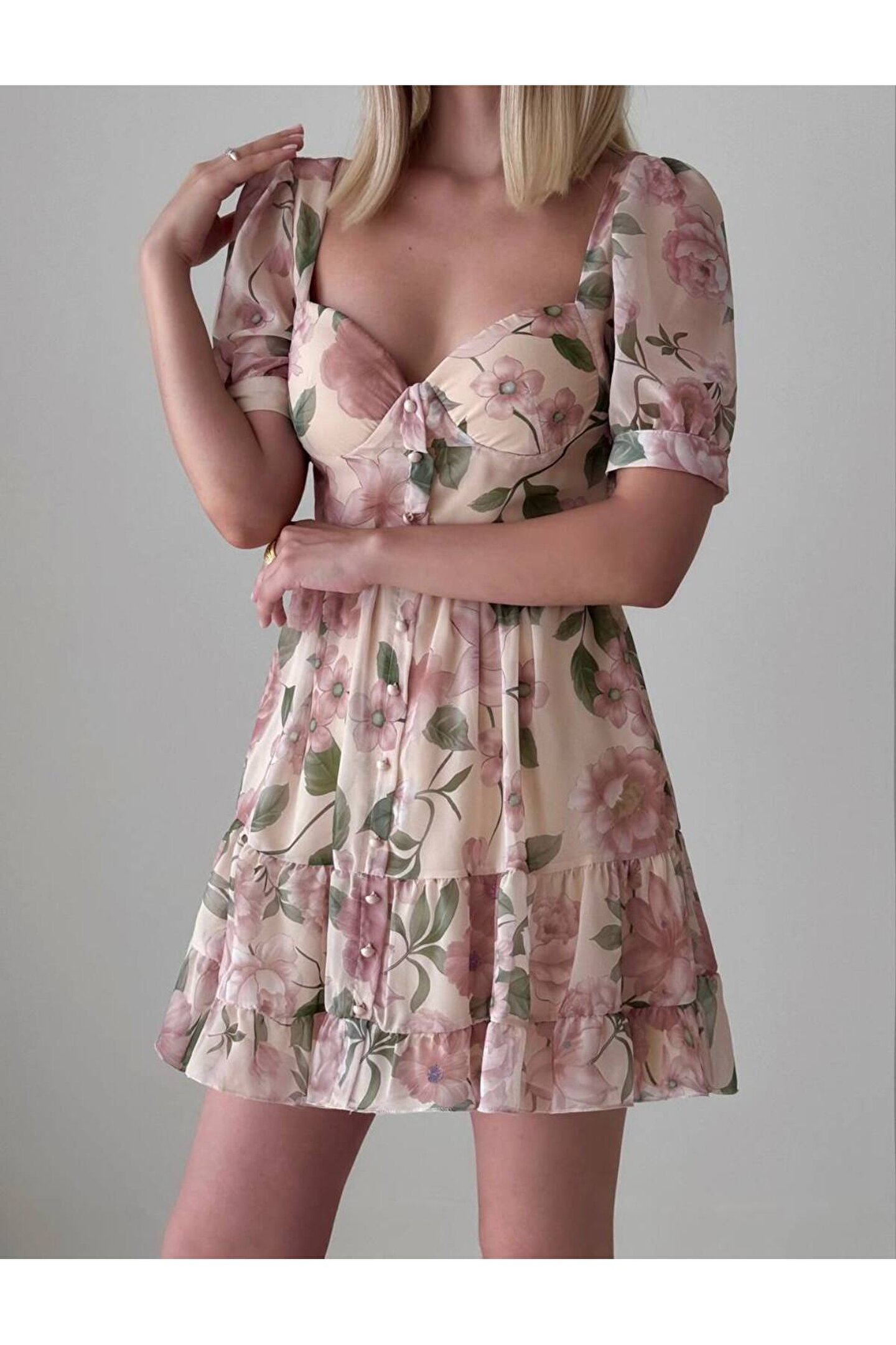 - Hafif ve zarif şifon kumaşı ile yaz aylarının vazgeçilmezi, mini boy elbise; - Belinizi saran bele oturan kalıbı sayesinde şık ve feminen bir siluet sunar; - Kısa kollu tasarımı ile rahat hareket etme özgürlüğü sağlar ve sıcak havalarda serinlik hissi verir; - Düğme detayları ile modern ve şık bir görünüm kazandırırken, genç yaş grubuna hitap eden dinamik bir stil oluşturur; - Şifon materyali sayesinde hafif ve nefes alabilen yapısıyla gün boyu konforlu bir kullanım sunar;