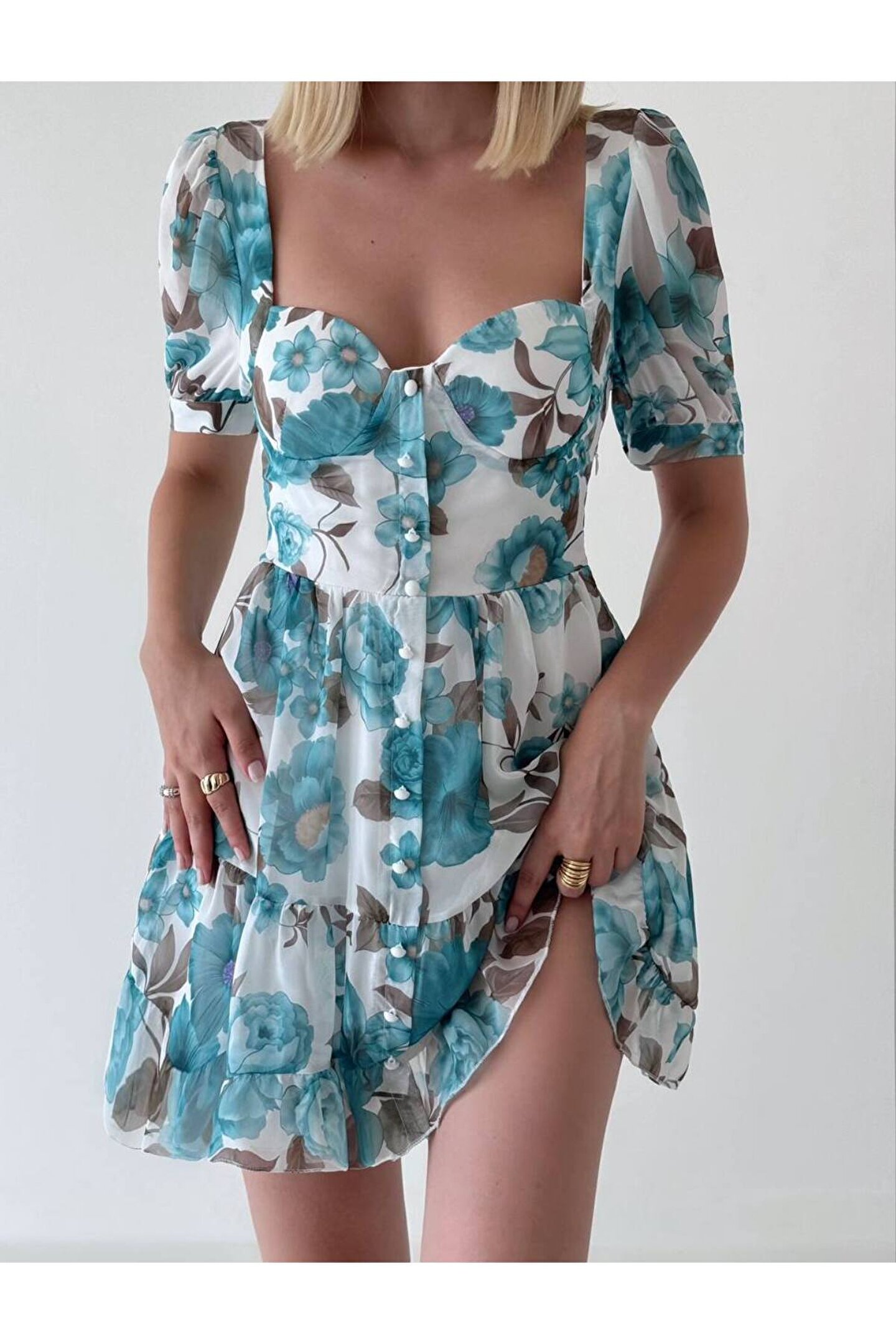 popibutik Kısa Kol Gloplu Düğme Detaylı Şifon Kumaş Mini Mavi Elbise