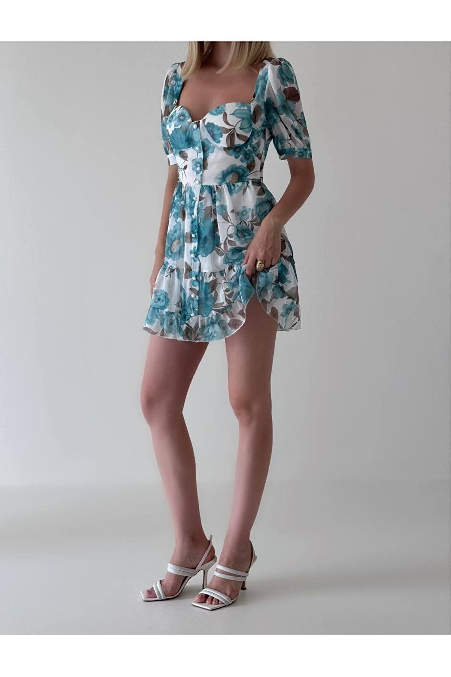 Zarif düğme detayları ile süslenmiş, şık ve modern bir görünüm sunar; Kısa kollu tasarımı sayesinde rahat hareket etme özgürlüğü sağlar; Hafif ve nefes alabilen şifon kumaşı, yaz aylarında serinlik ve konfor sunar; Mini boyu ile feminen ve dinamik bir stil yaratır; Belirtilmemiş kumaş tipi, esneklik ve rahatlık için idealdir; Bele oturan kalıbı sayesinde vücut hatlarını zarifçe sarar ve şık bir siluet oluşturur; Genç yaş grubuna hitap eden tasarımıyla enerjik ve canlı kombinler için uygundur; Şifon materyali, hafifliği ve zarafetiyle dikkat çekerken, kolay bakım imkanı sunar;
