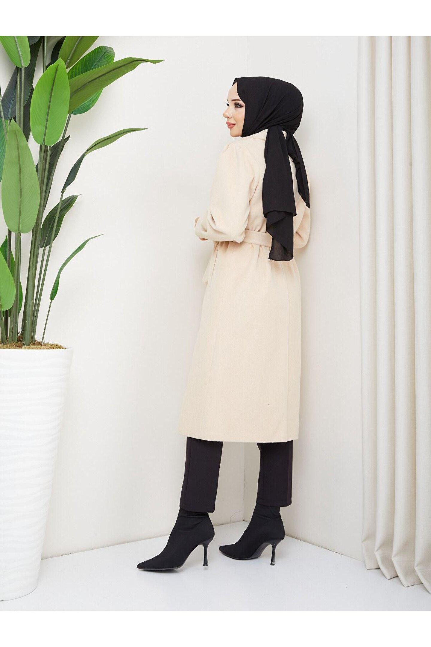 • Kol Detaylı Kaşe Kumaş Kuşaklı Düğmeli Midi Boy Kaban