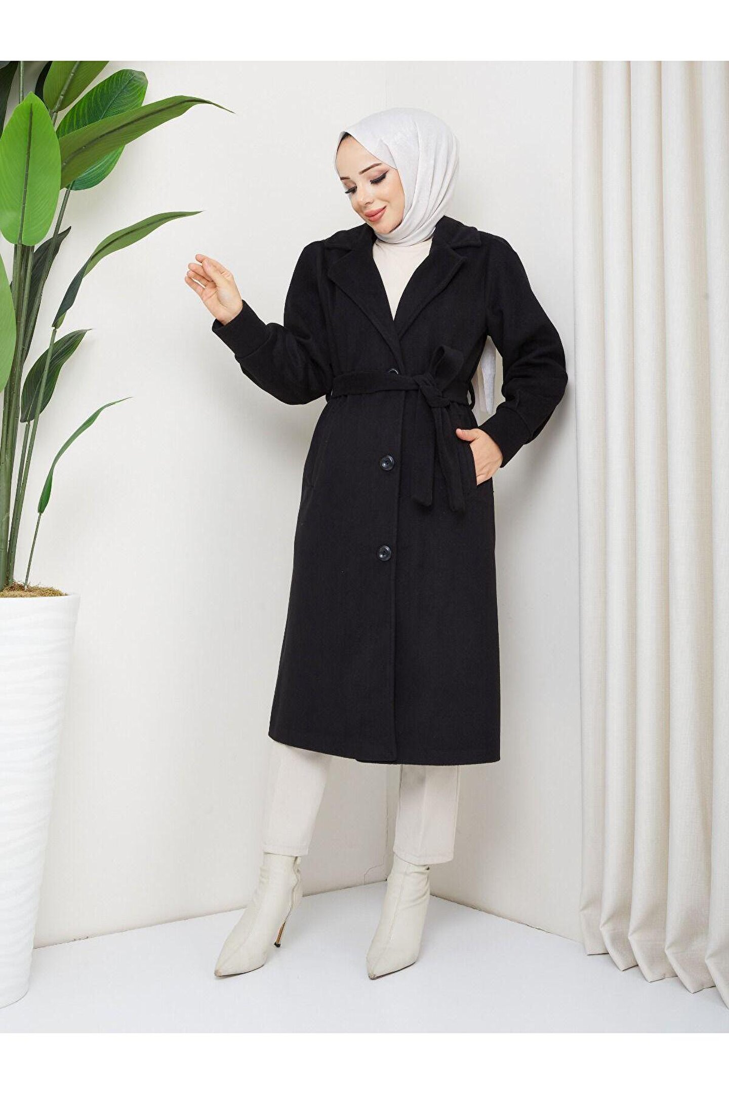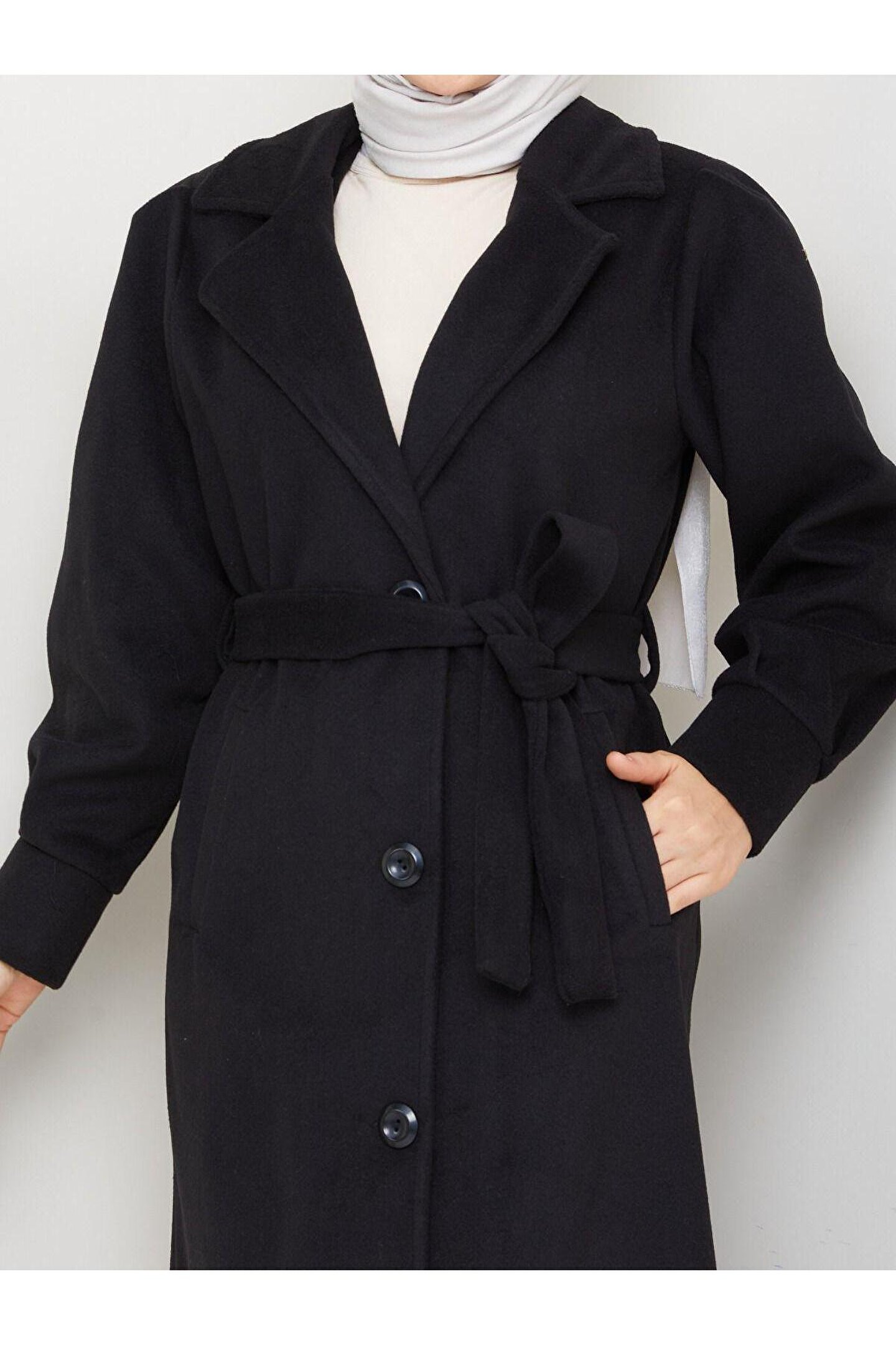 • Kol Detaylı Kaşe Kumaş Kuşaklı Düğmeli Midi Boy Kaban