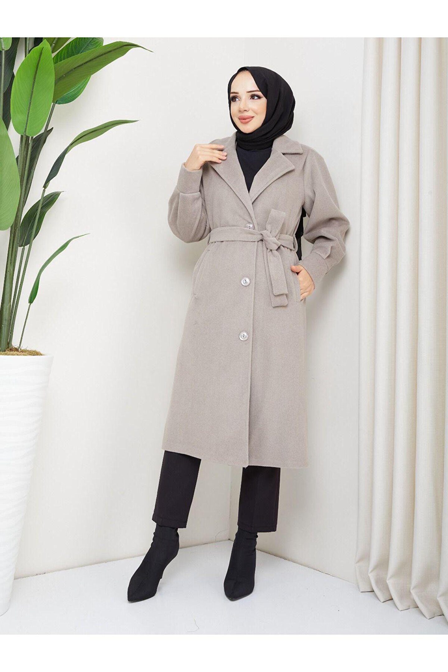 popibutik Kol Detaylı Kaşe Kumaş Kuşaklı Düğmeli Taş Midi Boy Kaban