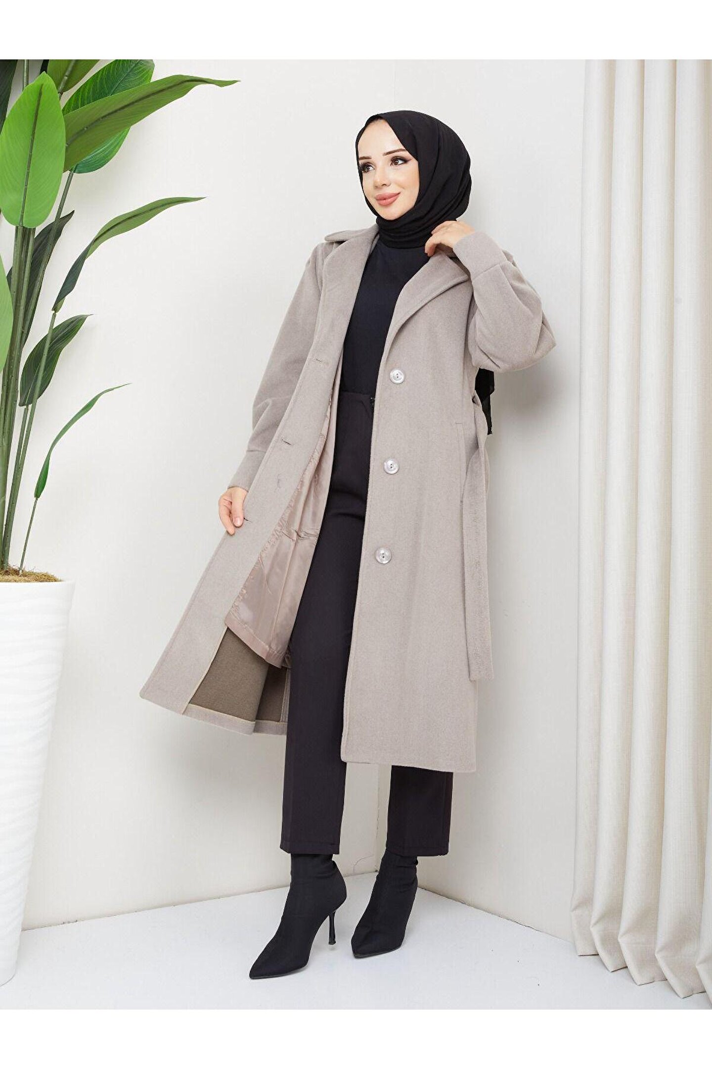 • Kol Detaylı Kaşe Kumaş Kuşaklı Düğmeli Midi Boy Kaban