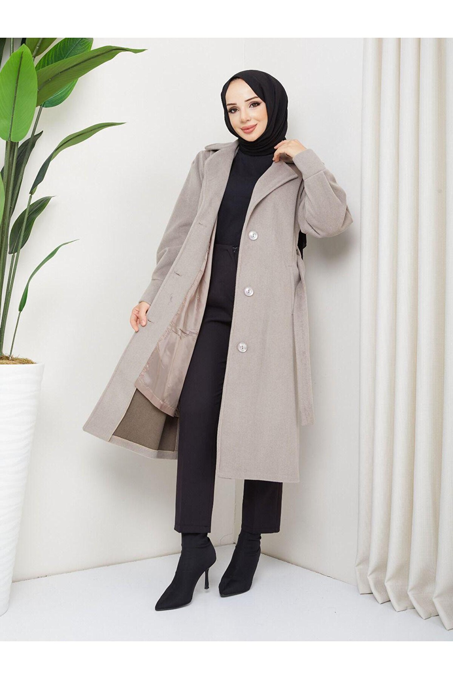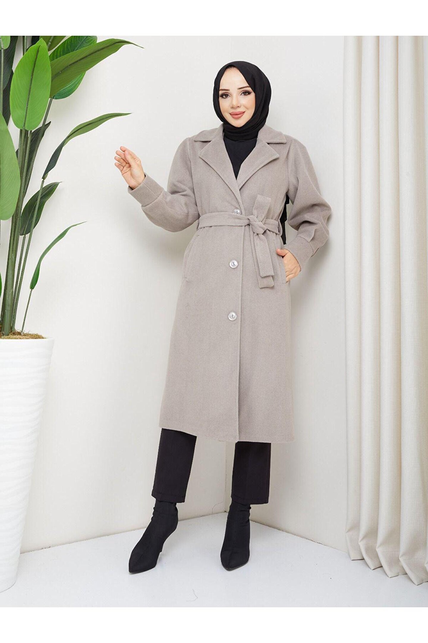 • Kol Detaylı Kaşe Kumaş Kuşaklı Düğmeli Midi Boy Kaban