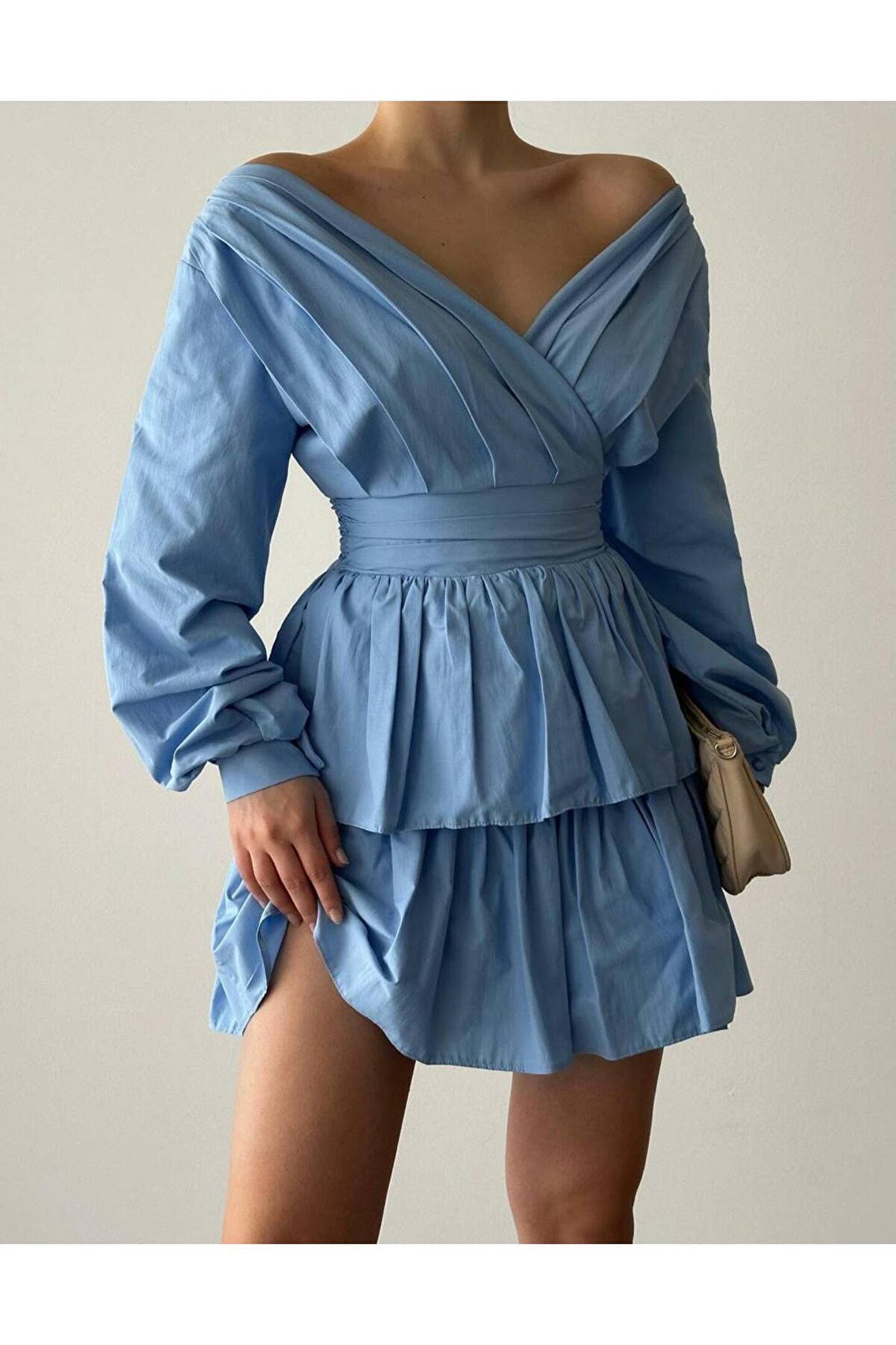 popibutik Korse Formlu V Yaka Kat Etekli Poplin Kumaş Mavi Mini ELbise