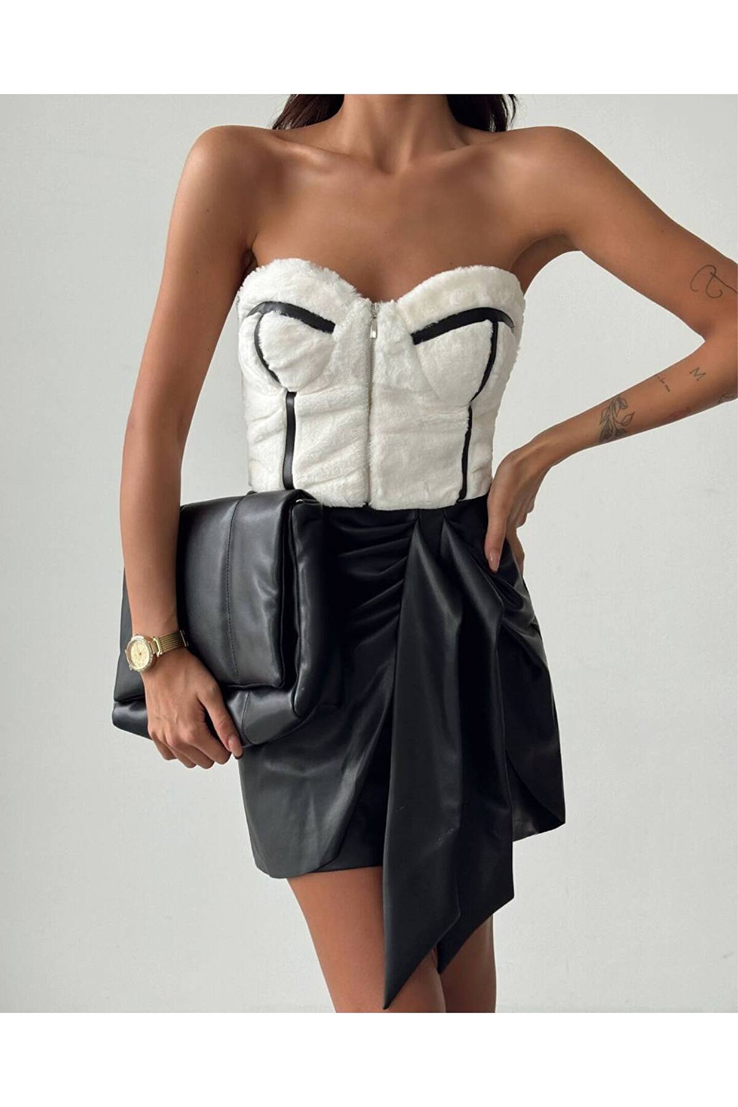 Bu şık ve modern alt; üst takım, her yaştan kadının gardırobunda yer almayı hak eden bir parçadır; Slim kesimi ile vücut hatlarınıza mükemmel uyum sağlayarak feminen bir siluet çizer; Crop deri eteğin üzerindeki düz desen, zamansız bir şıklık katarken, örme kumaş tipi konforlu bir kullanım sunar; Gençlerin enerjisini yansıtan bu takım, günlük kombinlerinizde dinamik ve modern bir görünüm elde etmenizi sağlar; ;;