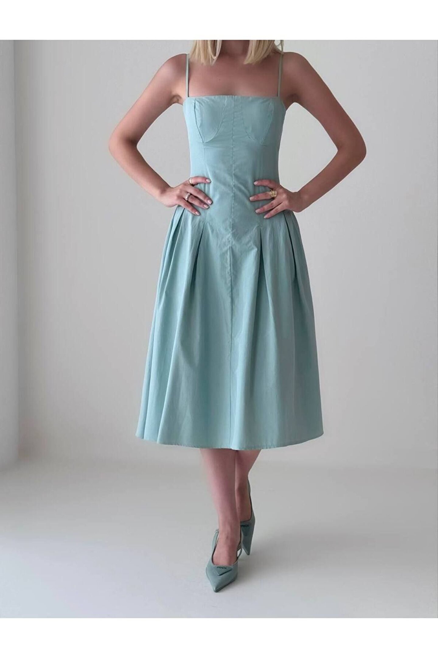 popibutik Pile Etek İnce Askılı Korse Formlu Poplin Kumaş Su Yeşili Midi Elbise
