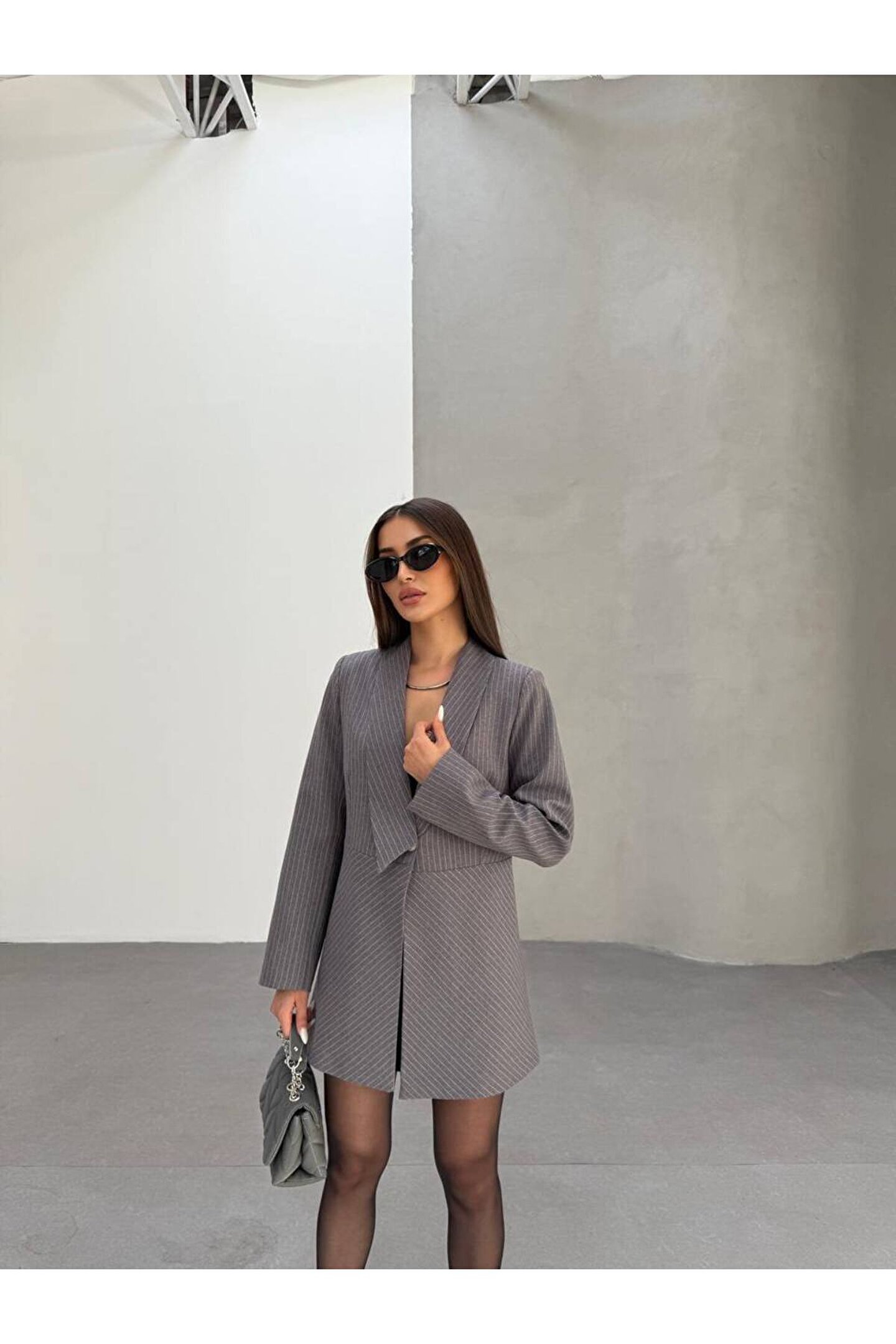 şal yaka tasarım uzun blazer / ceket elbise formu çizgili dokulu şık kumaş rahat modern kesim hem günlük hem özel davetlerde kullanılabilir ofis-kokteyl-akşam kombinlerine uygundur.;