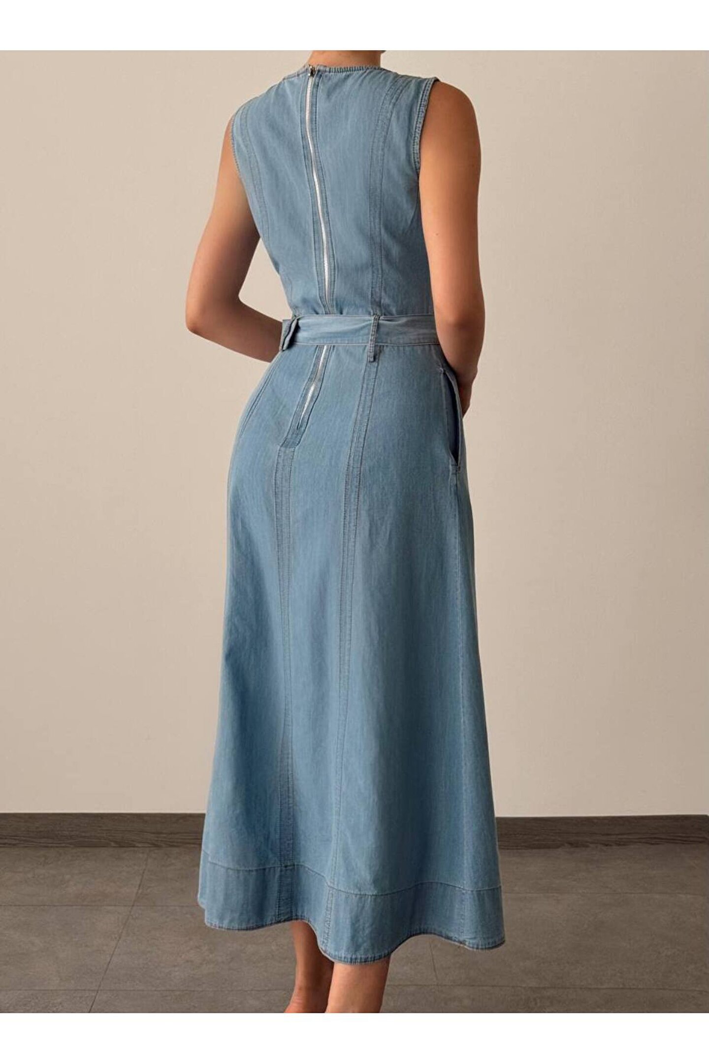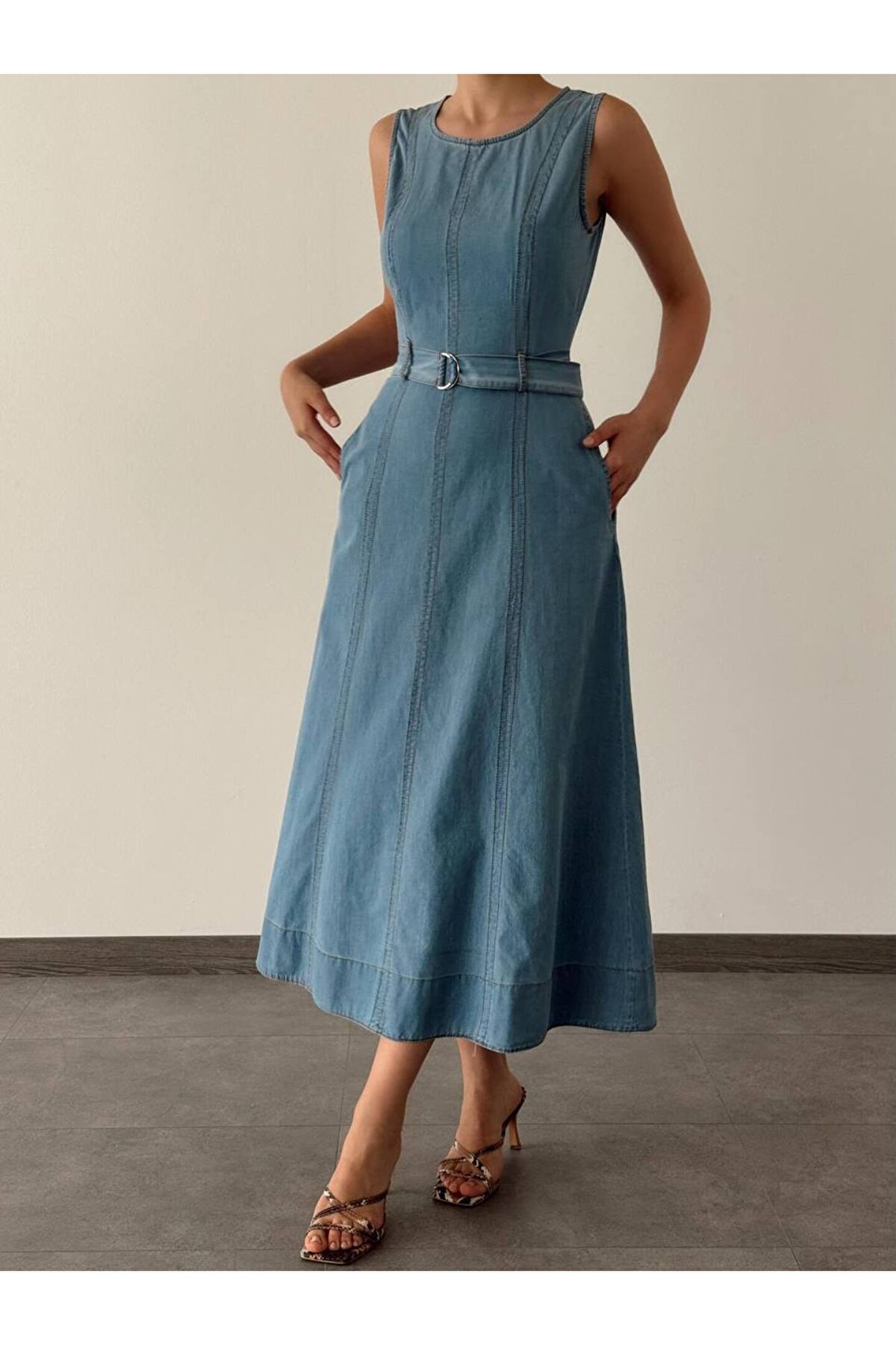 popibutik Sıfır Kol Kemer Detaylı Midi Boy Buz Mavi Elbise