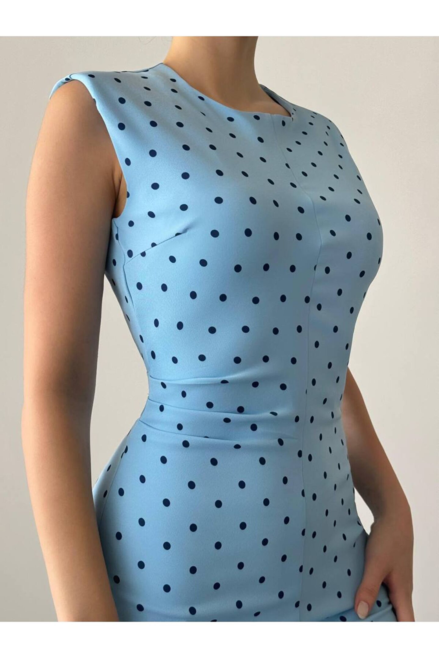popibutik Sıfır Kol Puantiyeli Mavi Mini Elbise
