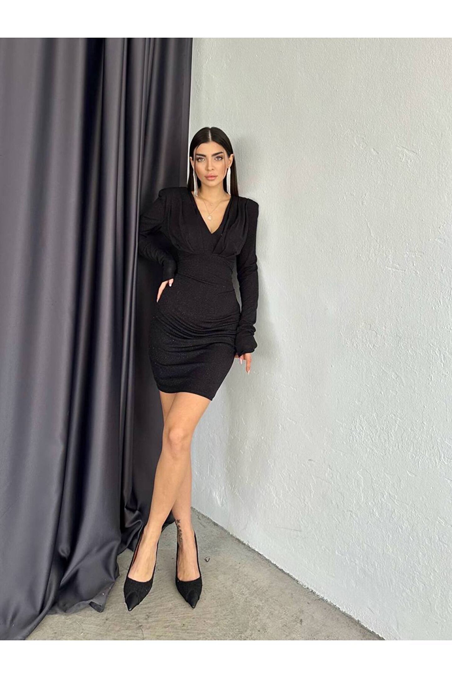 Gençlerin enerjisini ve stilini yansıtan bu simli v yaka elbise, her yaştan kadının beğenisine hitap eder.; Örme kumaşı sayesinde rahat hareket etme imkanı sunar ve tüm gün konfor sağlar.; V yaka tasarımı ile feminen çizgileri ön plana çıkarır ve zarif bir görünüm kazandırır.; Düz kesimi sayesinde modern ve şık bir siluet oluştururken, mini boyu ile göz alıcı bir etki yaratır.; Simli detaylarıyla ışıltınızı gece boyunca korumanızda yardımcı olurken, her ortamda dikkat çekmenizi sağlar.;