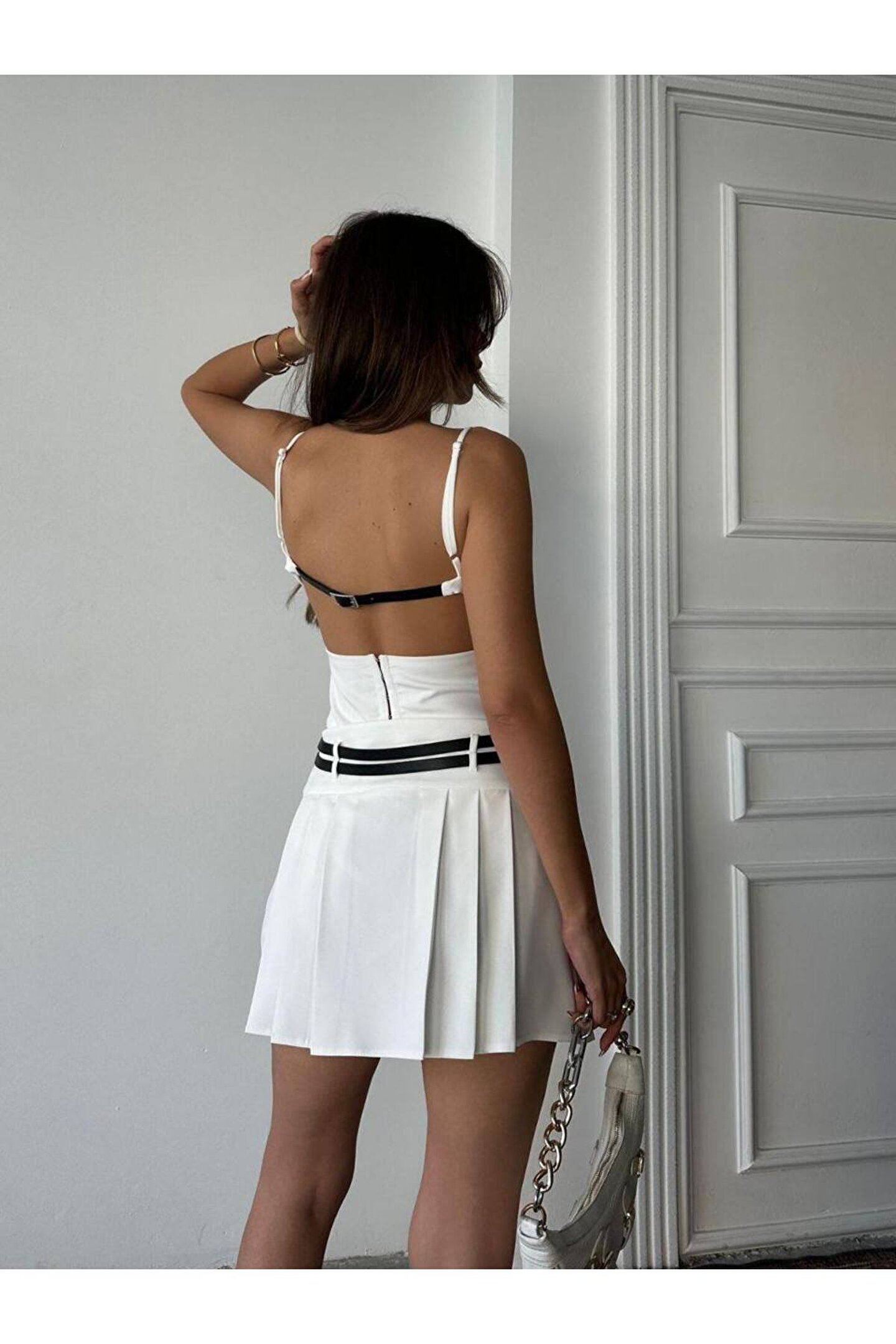 popibutik Sırt Dekolteli Kemerli Pileli Etek Likralı Mini Elbise