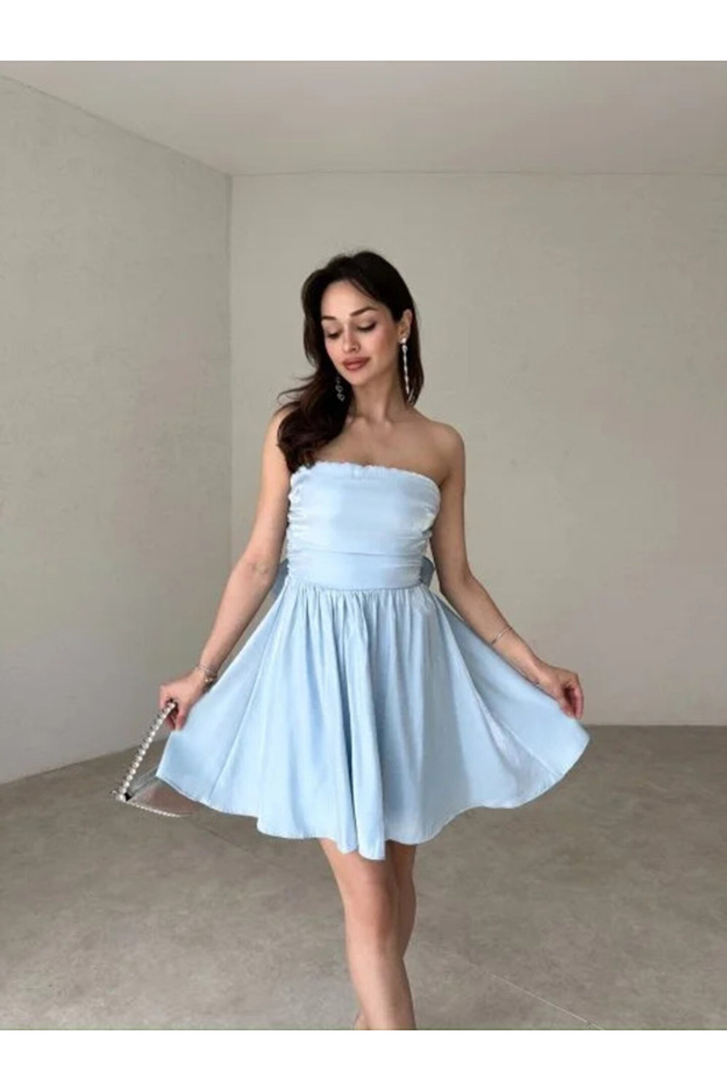 popibutik Sırt Fiyonk Bağlamalı Straplez Mini Parlak Saten Mavi Elbise