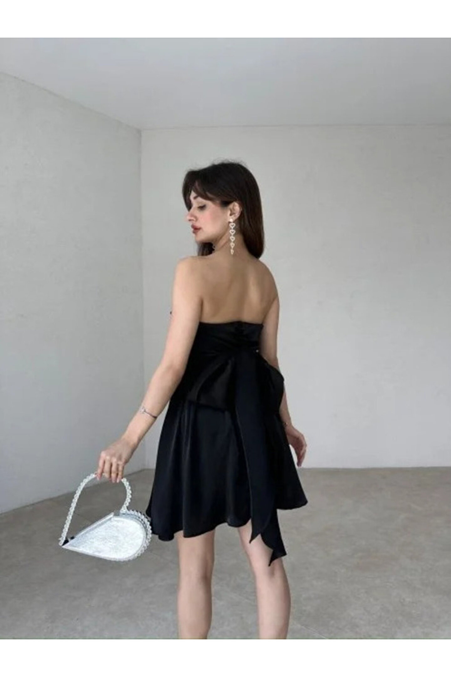 Zarif ve şık tasarımıyla dikkat çeken bu elbise, özel günlerinizde göz alıcı bir görünüm sunar; Mini boyu ile feminen ve modern bir siluet oluştururken, straplez kesimi sayesinde rahat hareket etme özgürlüğü sağlar; Dantel dokuma tipi, elbiseye sofistike bir hava katarken, siyah rengiyle her zaman asil ve şık duruşunu korur; Astarlı yapısı sayesinde konforlu bir kullanım sunarken, tüm yaş gruplarına hitap eden tasarımıyla geniş bir kullanıcı yelpazesine sahiptir; Slim kalıbı vücut hatlarını zarifçe sararak feminen bir duruş sergiler ve genç yaş grubuna özel olarak tasarlanmıştır; Parlak saten kumaşı ile ışıltınızı ön plana çıkarırken, sırt fiyonk detayıyla feminen detaylara yer vererek estetik bir dokunuş sağlar;