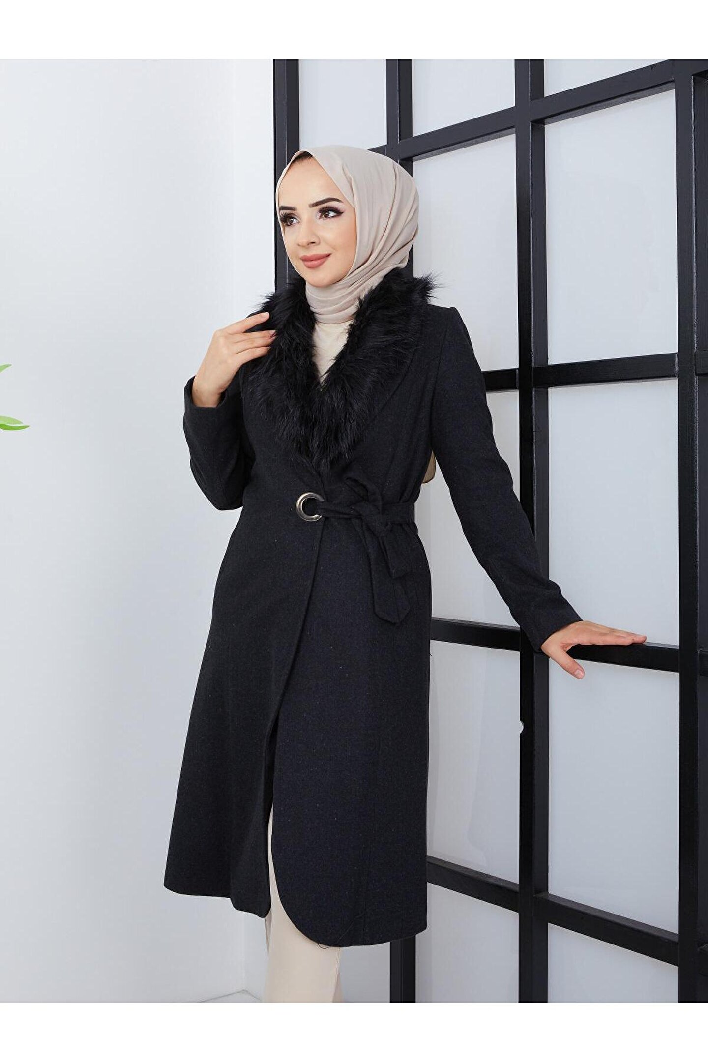 popibutik Yan Bağlamalı Çıkarılabilir Kürk Detaylı Antrasit Mini Kaban