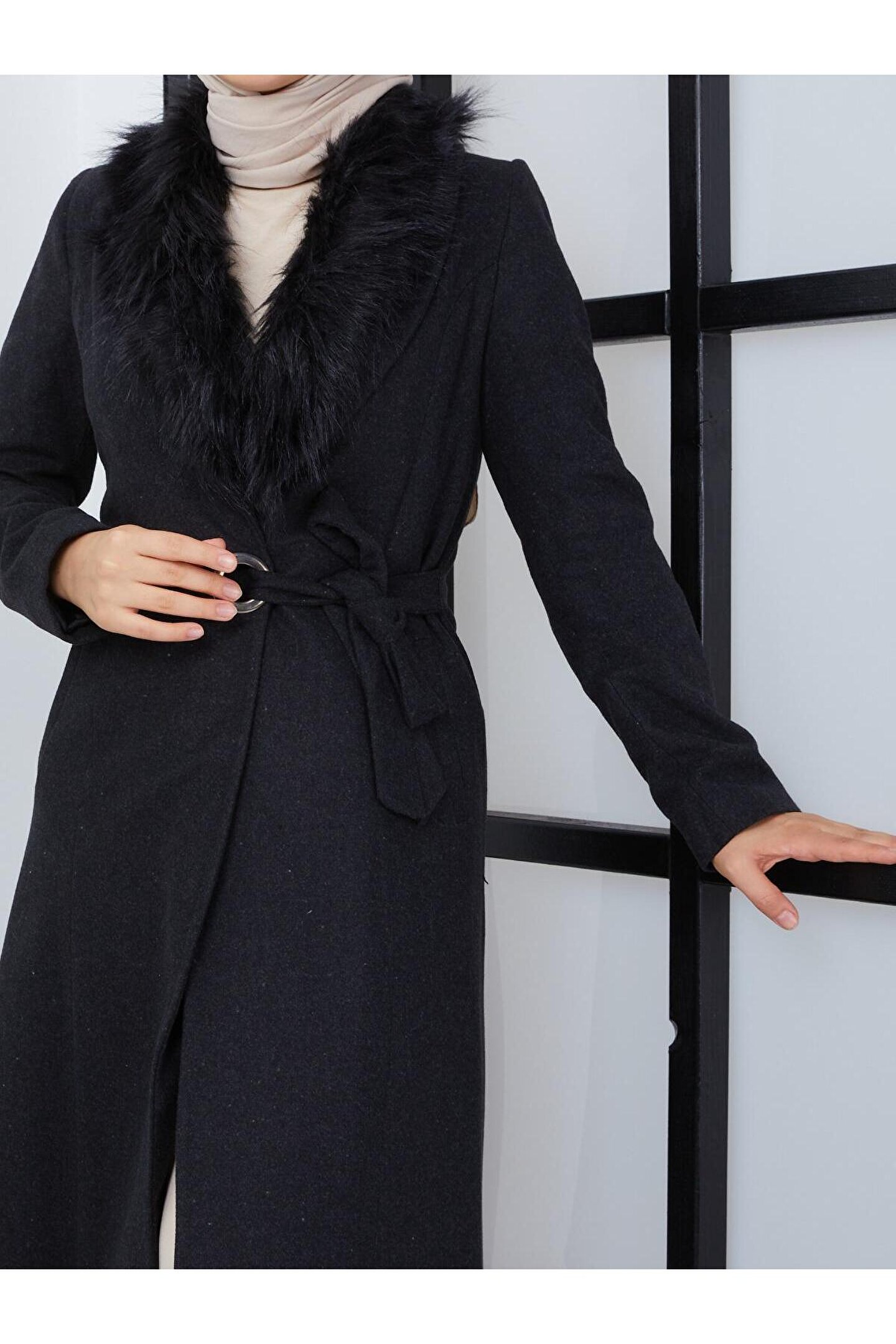 • Yan bağlamalı çıkarılabilir kürk detaylı antrasit mini kaban