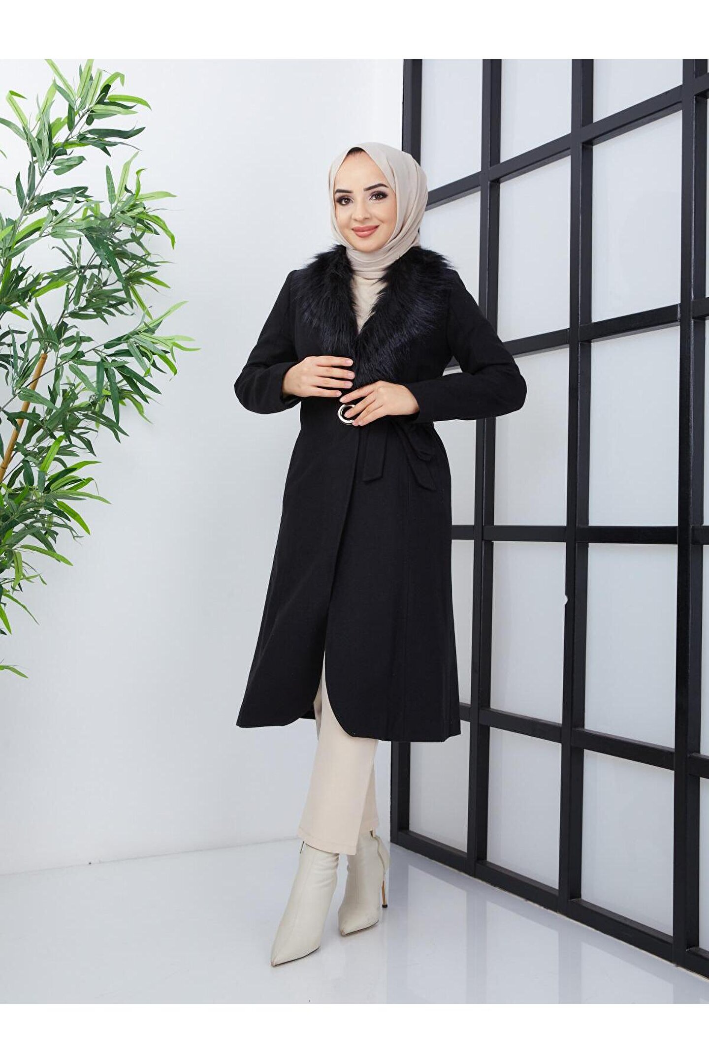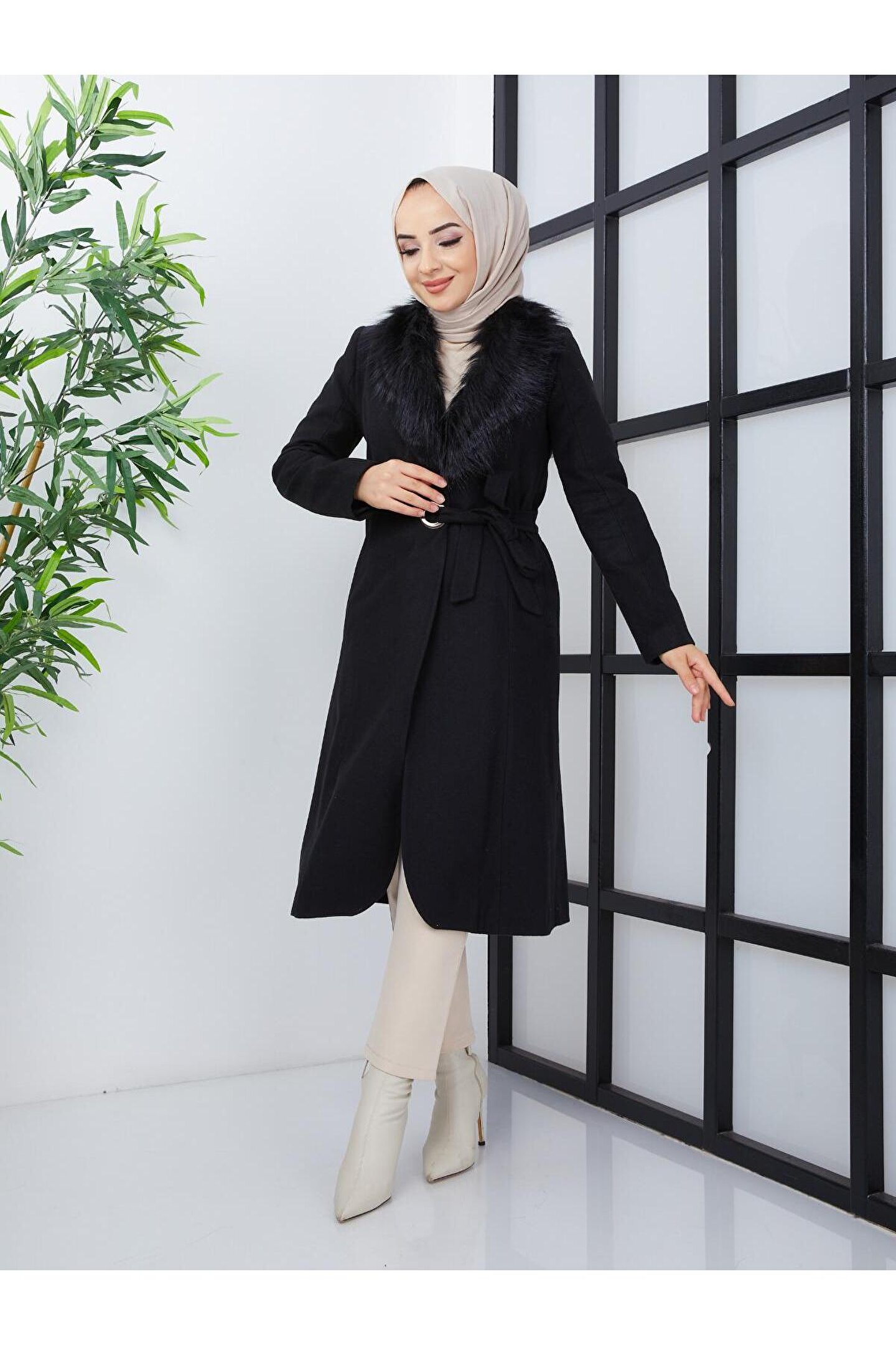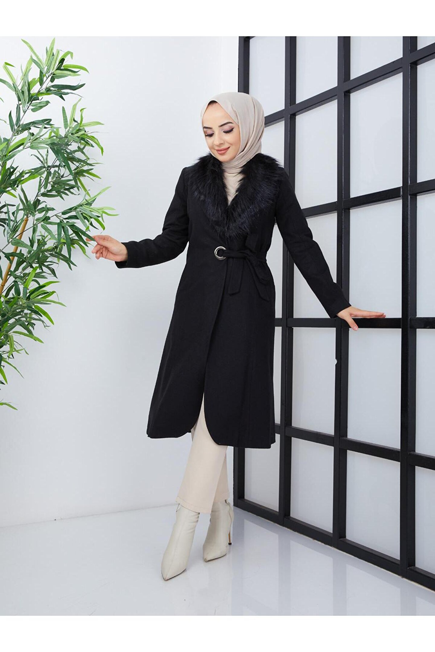 popibutik Yan Bağlamalı Çıkarılabilir Kürk Detaylı Siyah Mini Kaban