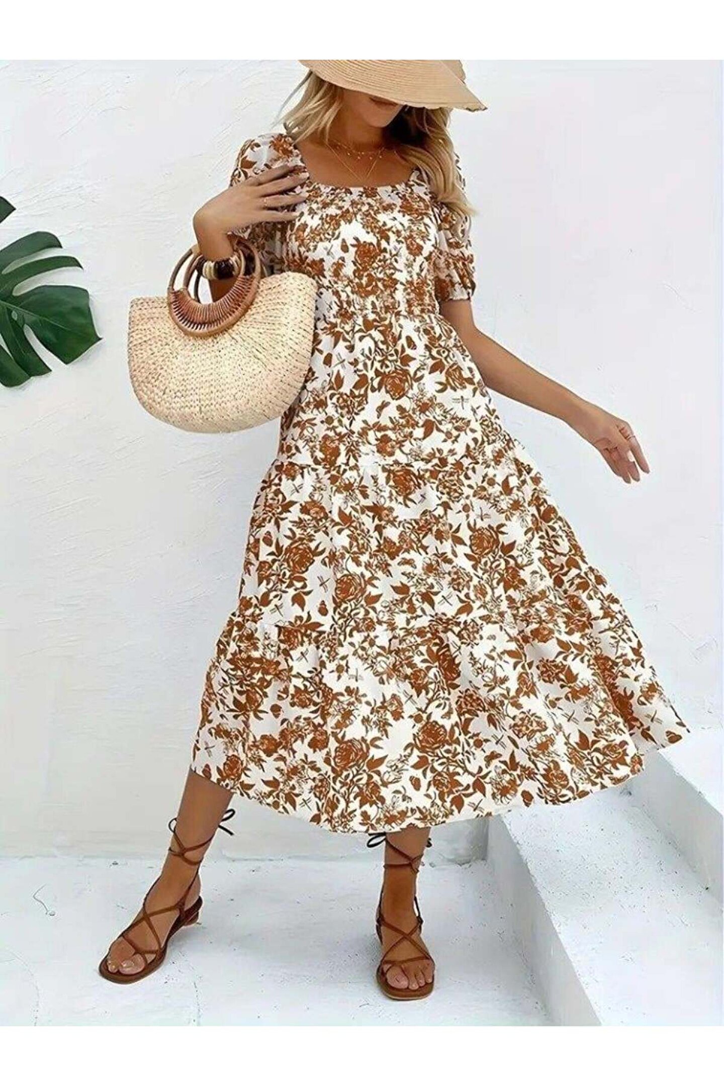 Kadın Kısa Kollu Kare Yakalı Lastikli Desenli Süprem Elbise