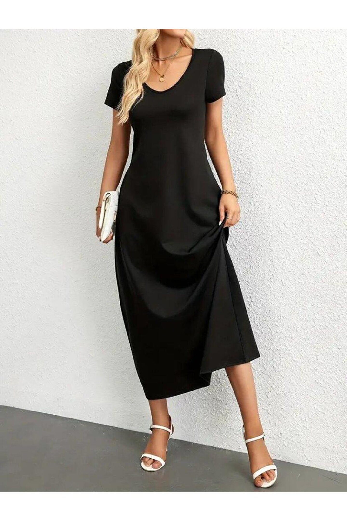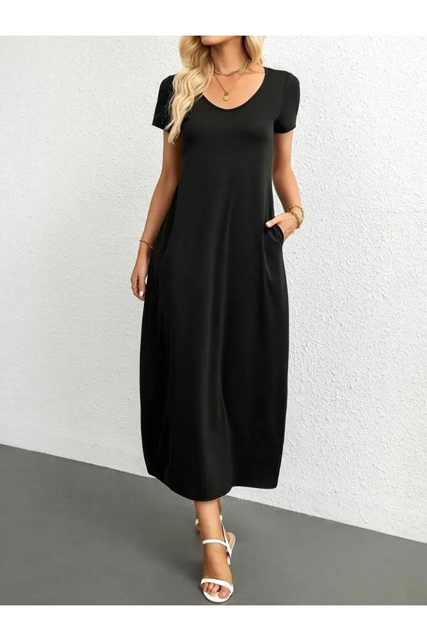 Kadın Kısa Kollu Yakası Yuvarlak Cepli Viskon Elbise