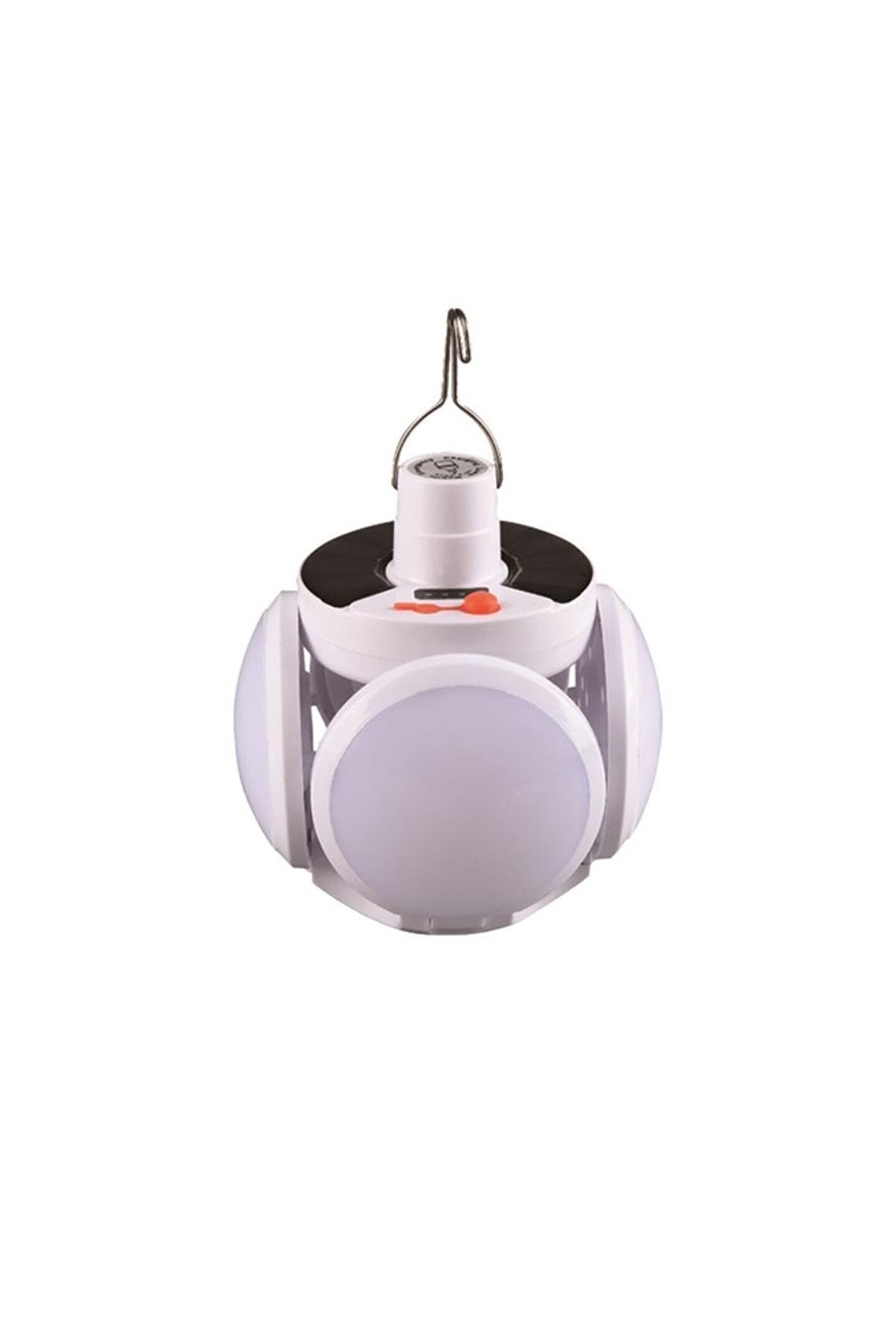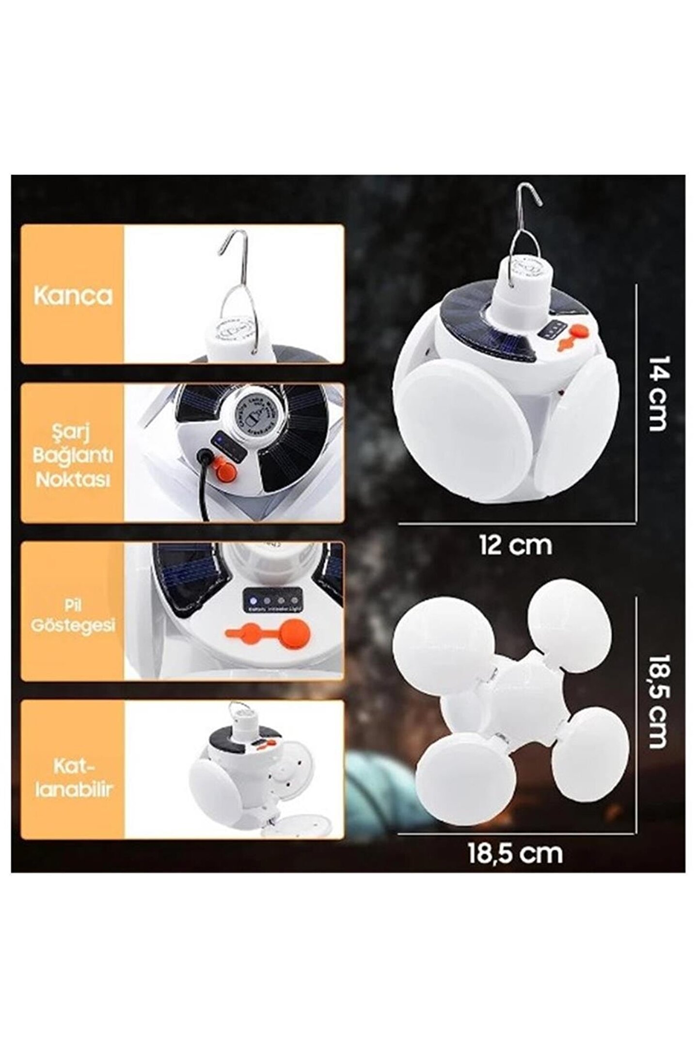 Solar Kamp Lambası Kampta karanlıkta kalmayın Enerji tasarruflu ve uzun ömürlü ışık Göz hassasiyetine uygun parlak ışık Lambanın açılır kanatları, ışığın geniş alanlara yayılmasını sağlar; 4 kademe pil seviye göstergesi Şarj süresi: 4; 5 Saat Kullanım Süresi: 4; 8 Saat 5 Işık Modu: 1; Az(Loş) Işık 2; Orta Işık 3; Yüksek Işık 4; Flaşör 5; SOS 5V USB Kablo ya da güneş enerjisi ile şarj olur;