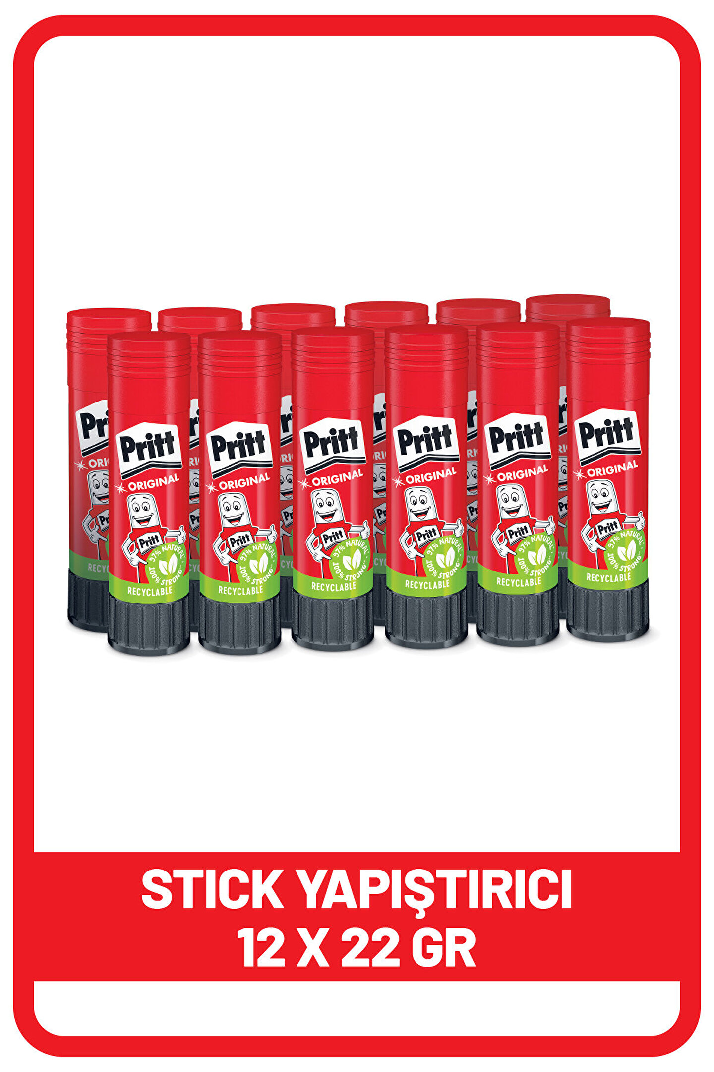 Pritt Stick Yapıştırıcı 22 Gr - 12 Adet;Eşsiz performans – Düşük sıvı içeriğiyle stick yapıştırıcı son derece kullanışlı ve dayanıklıdır. El işi aktiviteleri için veya okul yapıştırıcısı olarak idealdir.;Yaratıcılığınızı geliştirin – Çocuklar için güvenli el işi yapıştırıcısı ile çocuklarınızın yaratıcılığını geliştirin. Okul malzemesi olarak farklı kullanımlara uygundur.;Çocuk dostu – %97 doğal içeriği* ile tercih edilen, çocuklar için yapıştırıcı, el işi aktivitelerinden sonra düşük sıcaklıklarda yıkanabilir.;Etkin kullanım – Düşük sıvı içeren formülüyle bu yapıştırıcı, kağıt yüzeylerde kırışıklık bırakmaz. Sadece okul yapıştırıcısı değil ofis malzemesi olarak da idealdir.;Ambalaj içeriği – Pritt Stick Yapıştırıcı, kağıt, karton, kumaş, keçe ve fotoğraflar için solvent içermeyen ofis ve okul yapıştırıcısı, su dahil %97 doğal içerik, şeffaf, 12x22g;Hayallerini renklendir! Dayanıklı ve çocuk dostu Pritt Stick ile yaratıcılıkta sınır yok!;Zararlı kimyasallar içermeyen, dayanıklı ve kaliteli bu stick yapıştırıcıyla çocuklarınızın el işi aktivitelerinde sınırları kaldırın. %97 doğal içeriklerden oluşan formülüyle bu okul yapıştırıcısı, en güvenli yapıştırıcı formülüne sahiptir. Bu su bazlı yapıştırıcı, düşük ısılarda suyla bile temizlenebilir. Düşük sıvı içeren formül, kağıt yüzeylerde daha az kırışıklık bırakır. Güçlü ve pratik yapısıyla ofis malzemesi olarak da idealdir. Farklı boyutları sayesinde okul not defterine farklı malzemeler yapıştırmaktan büyük el işi projelerine, çocukların hayal güçlerini kullanarak yapabilecekleri her türlü etkinlik için uygundur. Bu el işi yapıştırıcısı, çocukların fikirlerini ortaya dökmelerine yardımcı olduğu gibi ideal bir ofis malzemesi olarak da her yaşta güvenle kullanılabilir!;Uygulama: Yüzeye (kağıt, karton vs.) hafifçe ve düzgün bir şekilde sürün. Yapıştırıcıyı kurumaya bırakmadan önce gerekirse yüzeyleri yeniden düzenleyin.;Ürünün Başlıca Faydaları:;Çocuklar için el işi yapıştırıcısı ve ofis malzemesi olarak uygundur;Yüksek performans;Çocuk dostu ve güvenli;%97 doğal içerik*;Etkin kullanım, dayanıklı;Kullanımı kolay;Kağıt, karton, kumaş, fotoğraf gibi farklı malzemeler için uygun;Düşük sıvı içeriğiyle kırışmayı en aza indirir;Solvent içermez ve yıkanabilir;1x22g;*Su dahil.