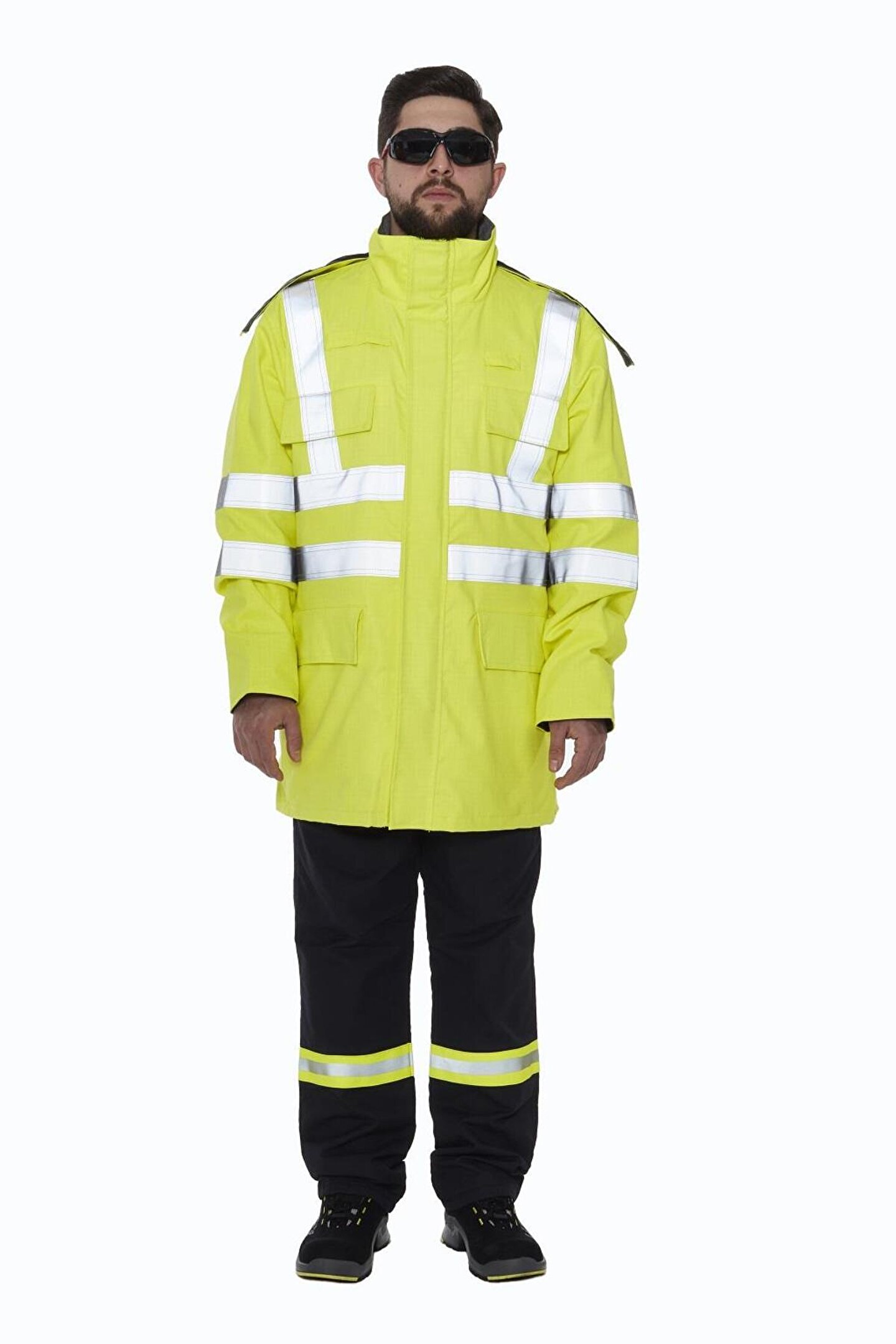 İTFAYECİ ALEV ALMAZ PETRO KİMYA YAĞMURLUK Yağmurluk, yangınla mücadele eden personelin; yangın söndürme çalışmaları esnasında ortaya çıkan su, alev ve sıcaklığın olumsuz etkilerinden korunması amacıyla kullanılır. (EU)2016/425 Kişisel Koruyucu Donanım sınıfına giren, özel tasarıma sahip yağmurluklardır. EN 343 Yağmura karşı koruma, EN1149-5antistatik, EN471 görülebilirlik, EN ISO 14116 yanmazlık “İtfaiyeciler için koruyucu giyecekler – standartlarına uygun olarak üretilir ve CE işaretlidir Teknik Bilgiler Yağmurluk, yangınla mücadele eden personelin; yangın söndürme çalışmaları esnasında ortaya çıkan su, alev ve sıcaklığın olumsuz etkilerinden korunması amacıyla kullanılır. (EU)2016/425 Kişisel Koruyucu Donanım sınıfına giren, özel tasarıma sahip yağmurluklardır. EN 343 Yağmura karşı koruma, EN1149-5antistatik, EN471 görülebilirlik, EN ISO 14116 yanmazlık “İtfaiyeciler için koruyucu giyecekler – standartlarına uygun olarak üretilir ve CE işaretlidir. K umaş: Plavitex Multi (PVC/cotton) K umaş kalınlığı: 0,65mm, K umaş ağırlığı: 530 gsm, R eflektifler: gri, aramid taşıyıcılı Çift kaynaklı dikişler Yakaya gizlenmiş ayarlanabilir başlık Dış tarafa kaynaklanmış cepler Gizlenmiş fermuar Rüzgar kesici kollar Havalandırma delikleri Reflektifler Bedenler: 48-62 (S-4XL)