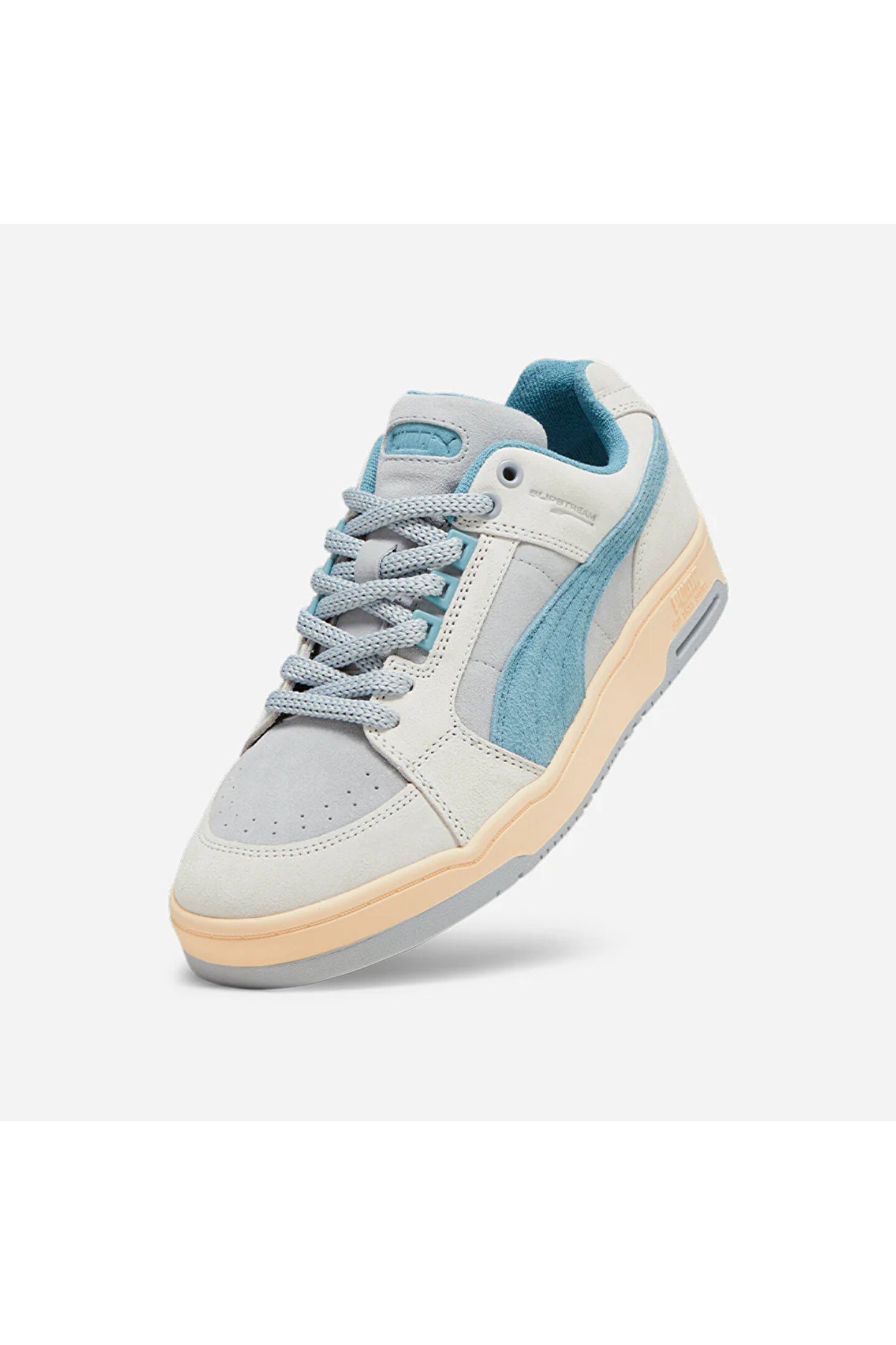 Mavi tonlu Puma Slipstream Lo Texture spor ayakkabı; delikli burun detayı, yandaki formstrip deseni, marka yazı detaylı dili ve dış tabanı ile dikkat çekiyor. Deri materyale sahip olan bu spor ayakkabı modeli, bağcıklıdır.